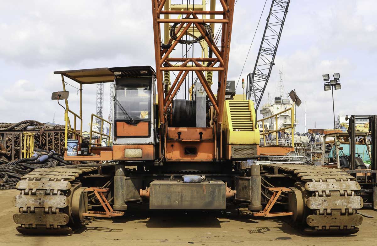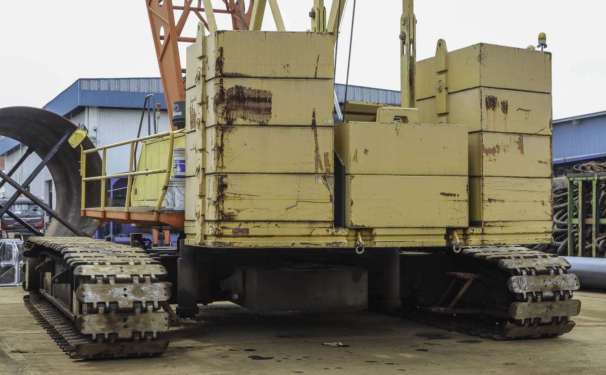 Dieser interessante Fuwa QUY150C wurde auf einer Werft in Singapur (SG) eingesetzt. Es handelt sich um einen 150-Tonnen-Raupenkran.