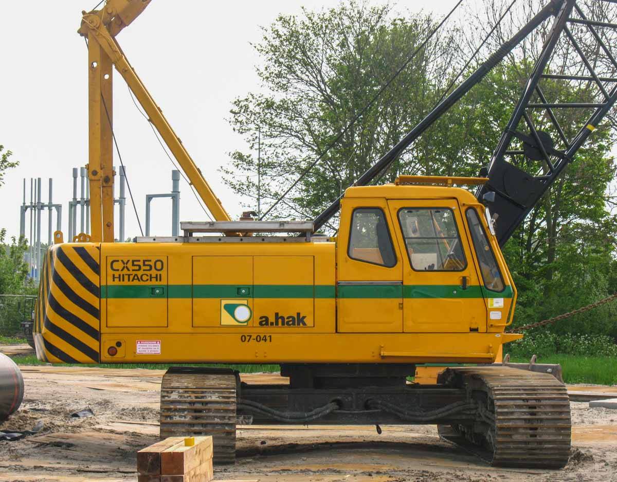 Dieser schöne Hitachi CX550 ist von A.Hak aus Tricht (NL) und wurde bei einem Einsatz in Opperdoes (NL) verwendet. Es handelt sich um einen 55-Tonnen-Raupenkran.