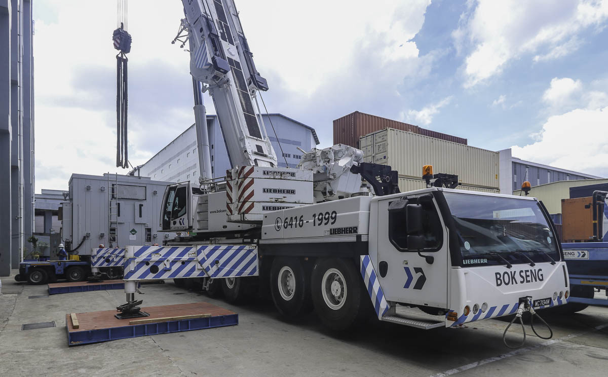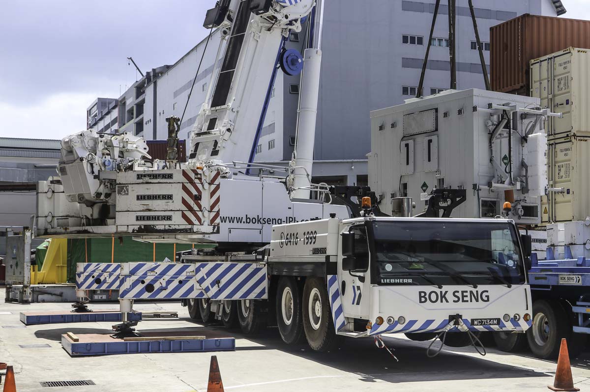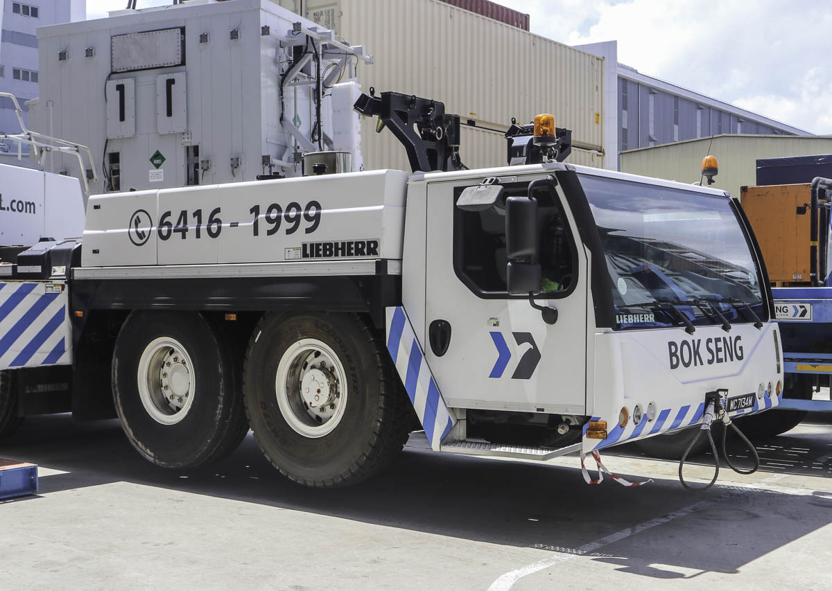 Um ein Skid auf dem Gelände von Bok Seng in Singapur (SG) zu heben sollte der Liebherr LTM 1350-6.1 zum Einsatz kommen. Einer der zwei MAN TGS 40.540 Zugmaschinen sollte ein 6-Achser Scheuerle Modulenanhänger mit der Last fahren.
