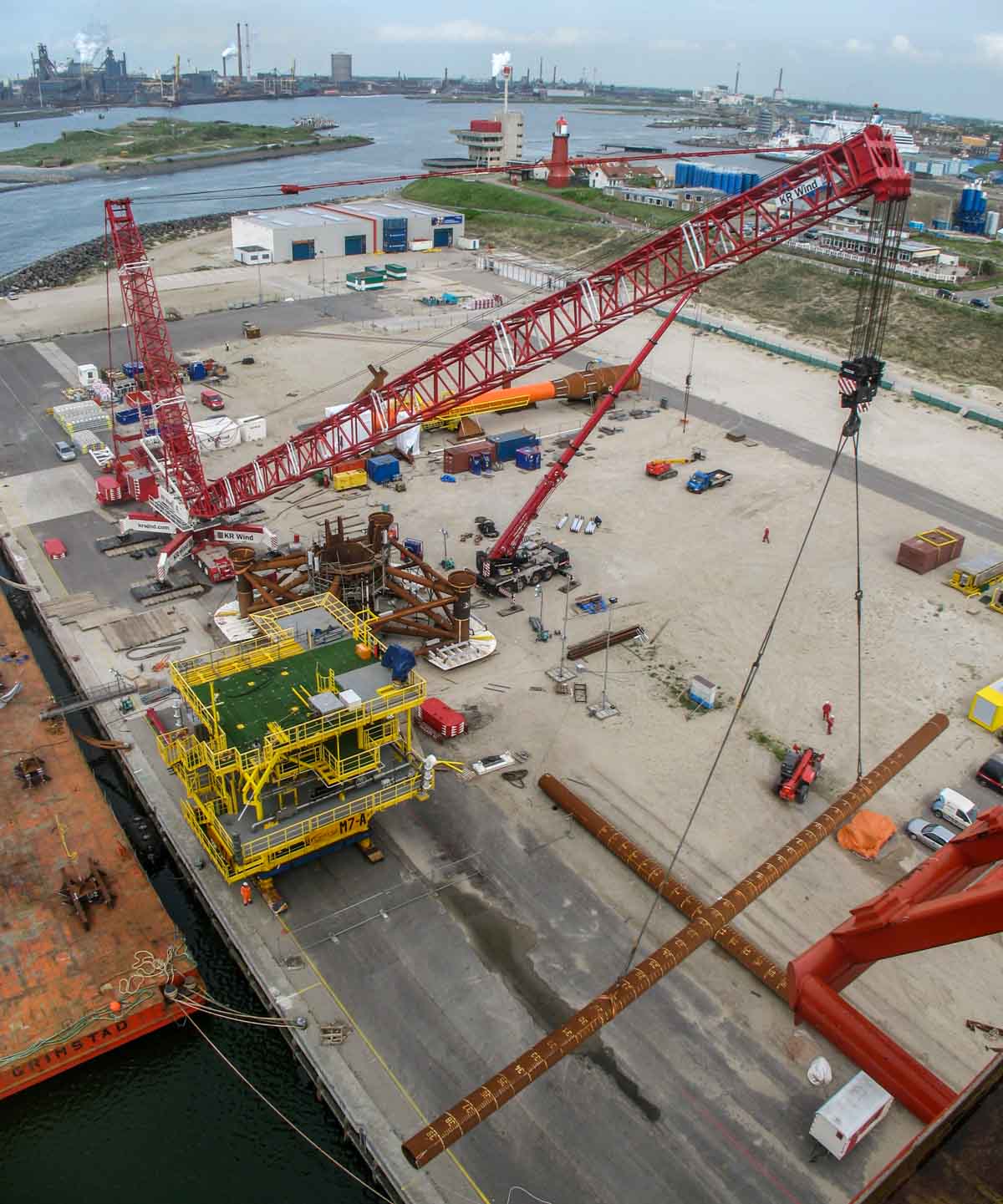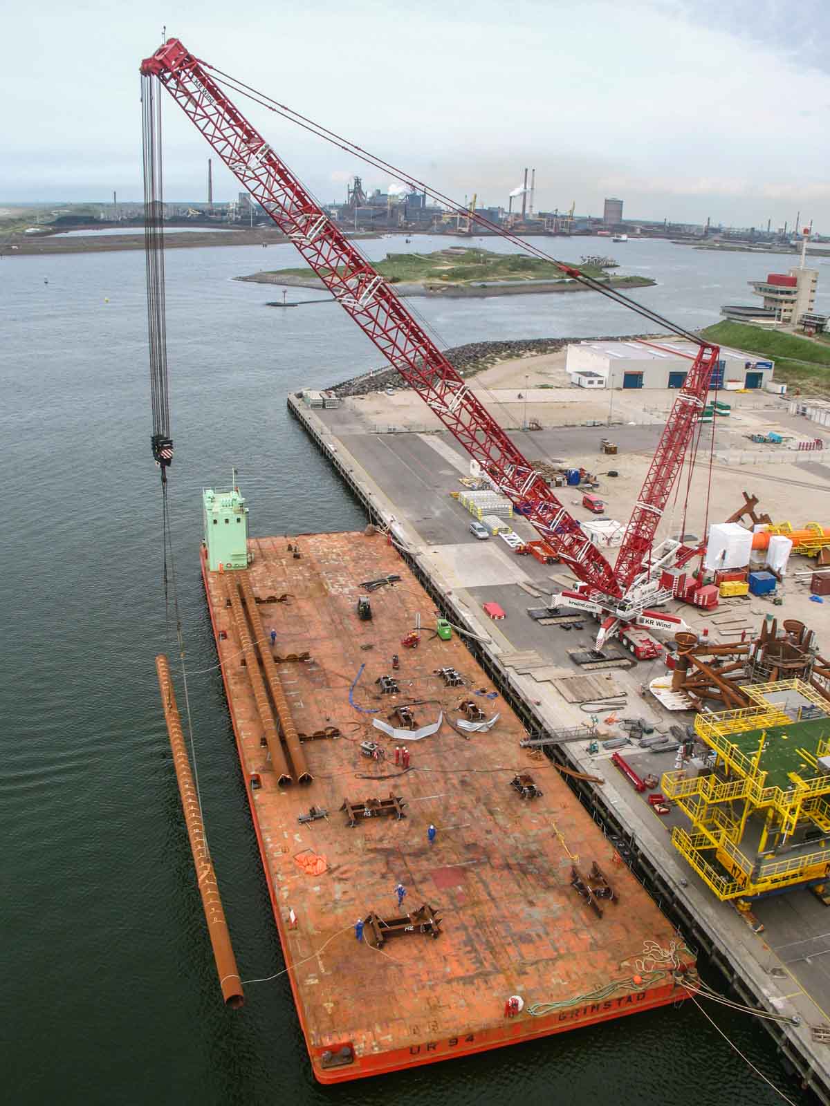 Die Ausladung beträgt etwa 70 Meter, die Rammpfähle sind 46 Meter lang und wiegen etwa 70 Tonnen.