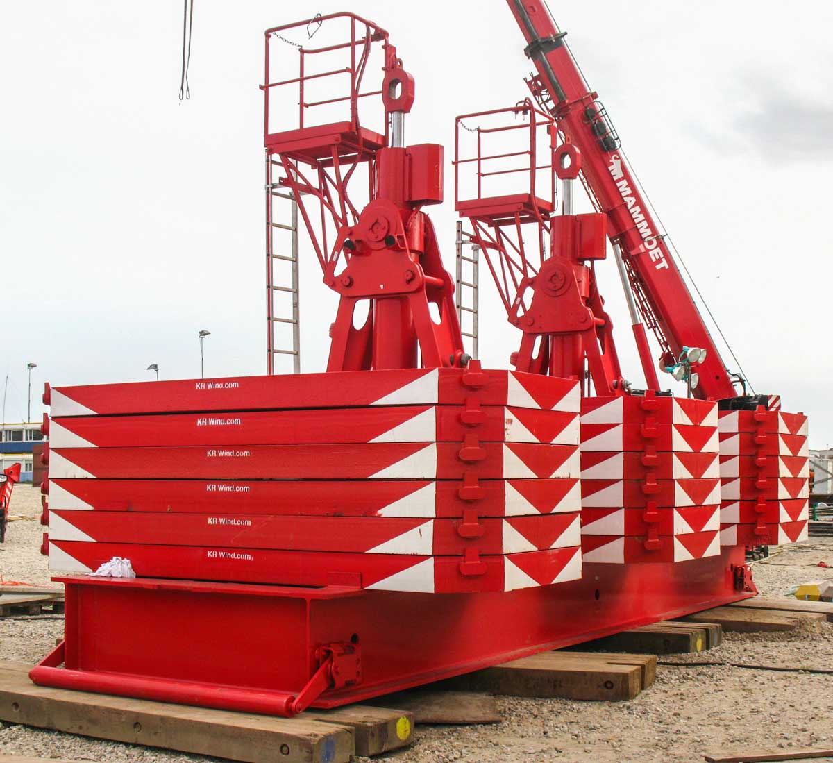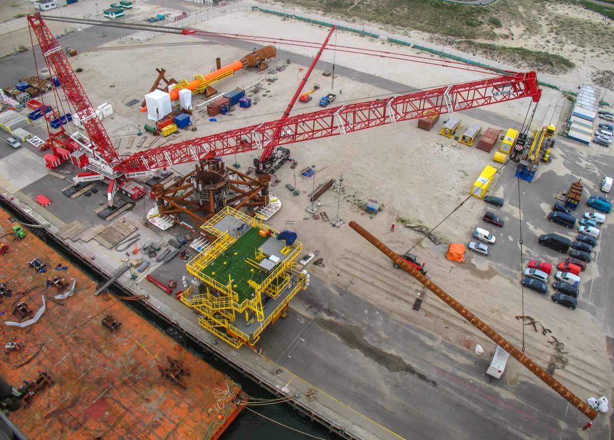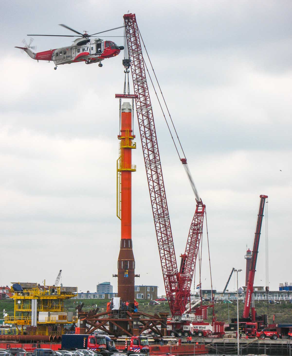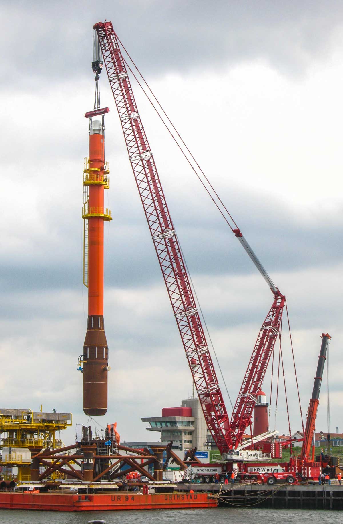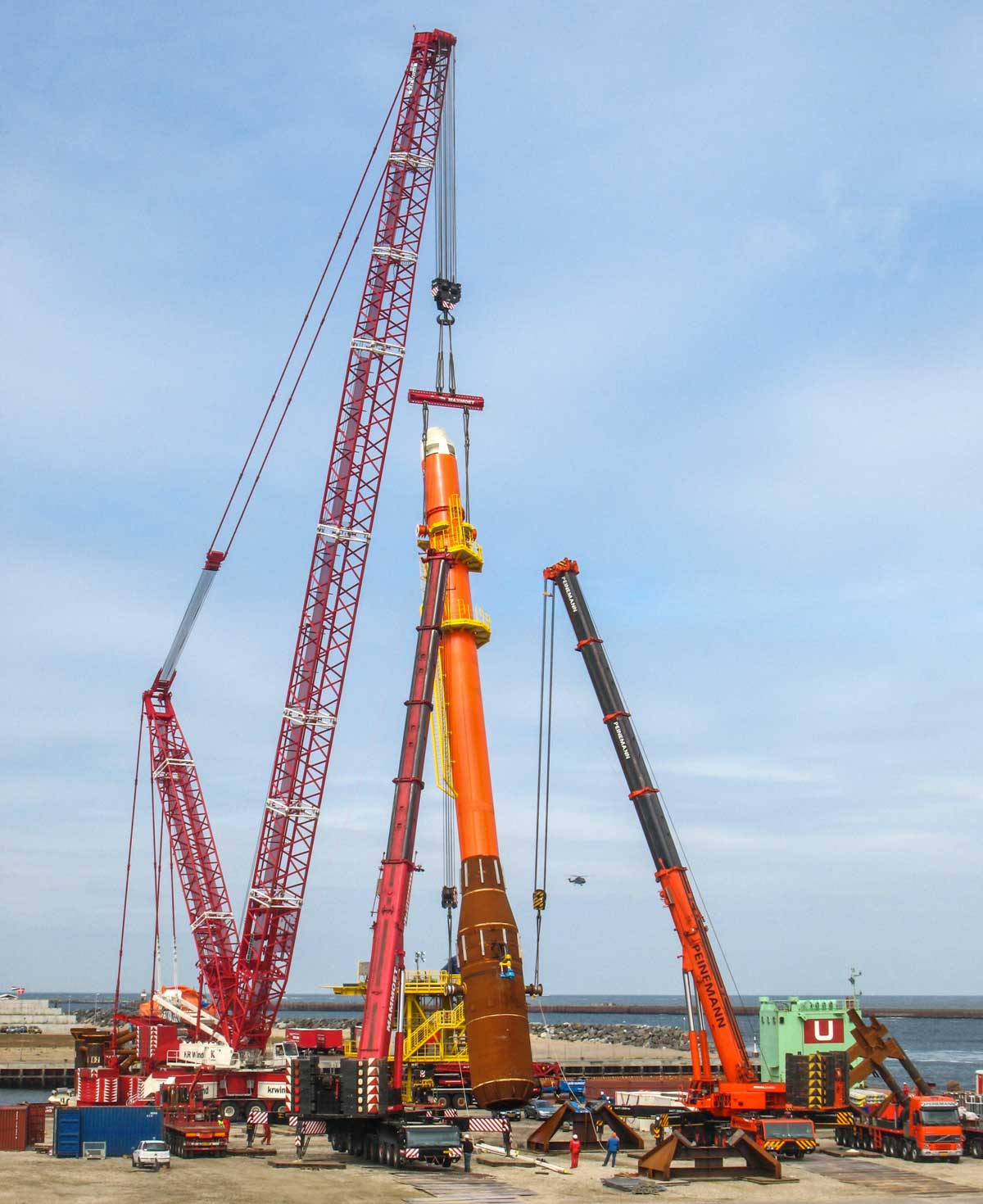 Dieser Monopile mit einem Gewicht von 265 Tonnen musste zunächst von einer horizontalen in eine vertikale Position gebracht werden. Zum Aufrichten des Monopiles wurden zwei Demag AC 650, von Mammoet und von Peinemann, eingesetzt.