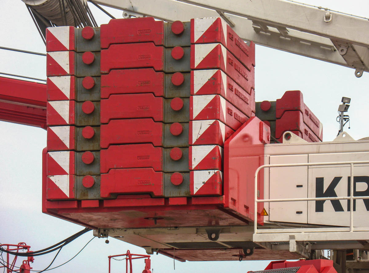 Auf der Superlift-Palette liegen insgesamt 18 Platten von jeweils 12 Tonnen gestapelt, das sind insgesamt 216 Tonnen. Der Superliftballast kann auf einen maximalen Gegenausleger-Radius von 20 Metern gebracht werden.