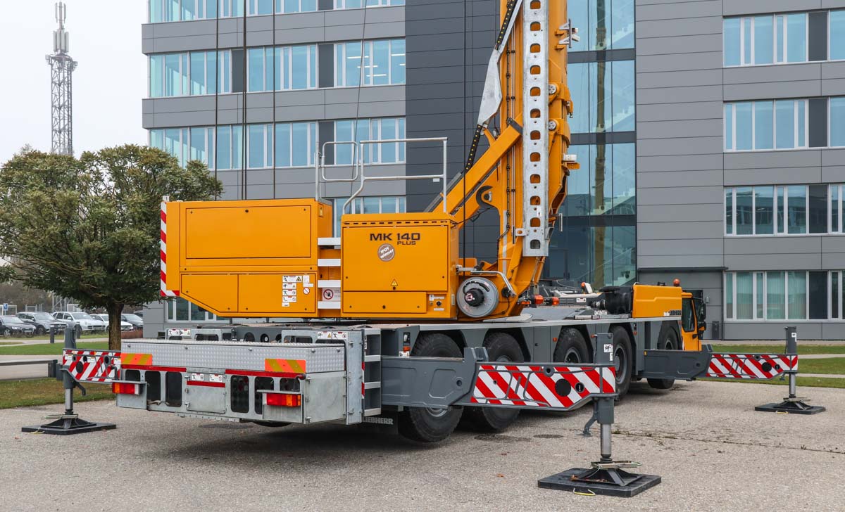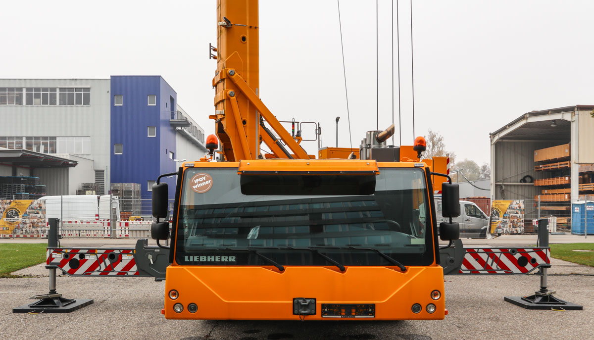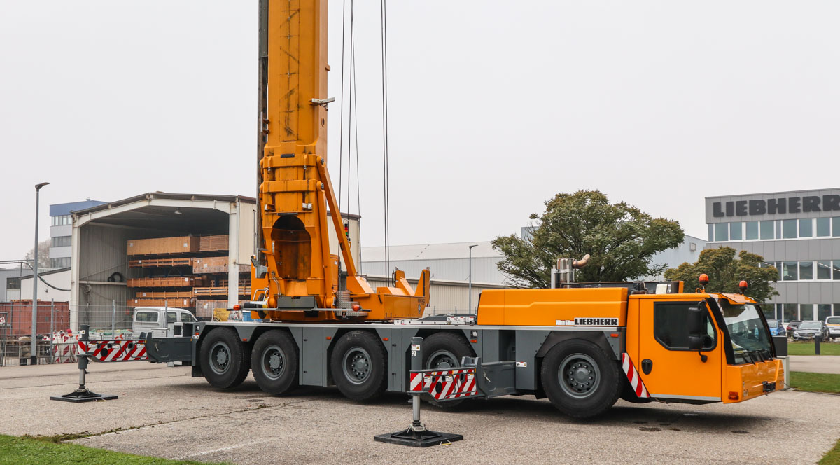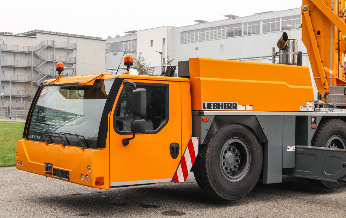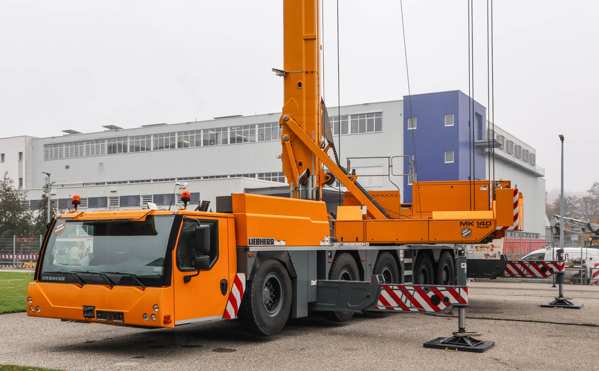 Dieser attraktive Liebherr MK 140 stand im Oktober 2021 auf dem Gelände des Herstellers zu Demonstrationszwecken. Es handelt sich um einen 140-tm-Turmdrehkran, der auf einem 5-achsigen Unterwagen montiert ist.