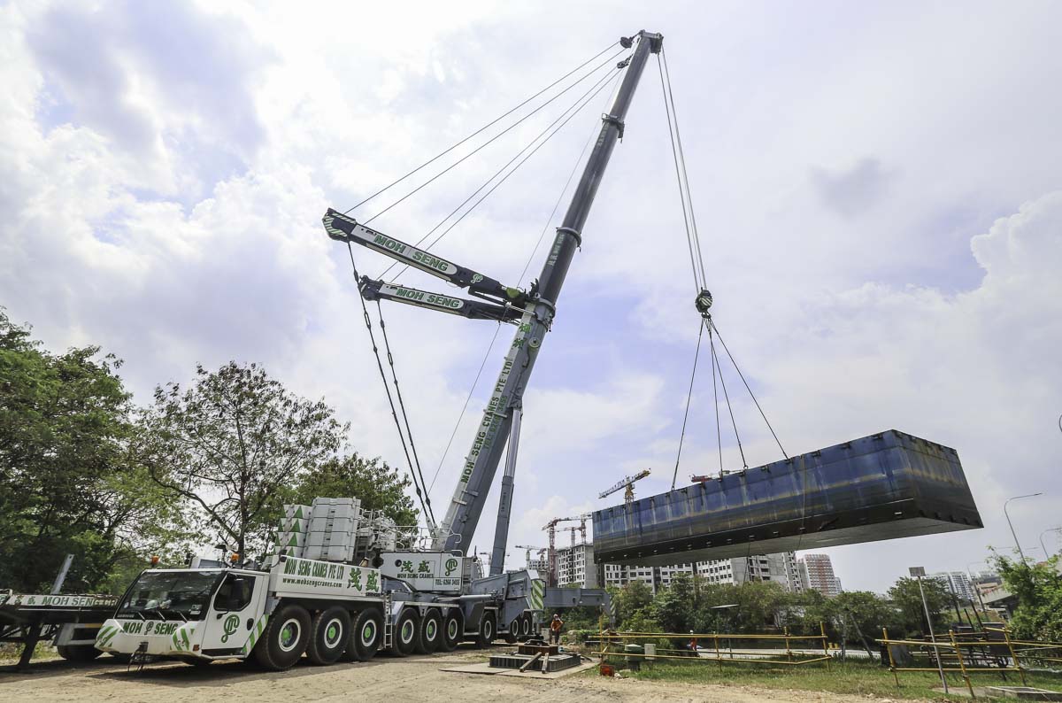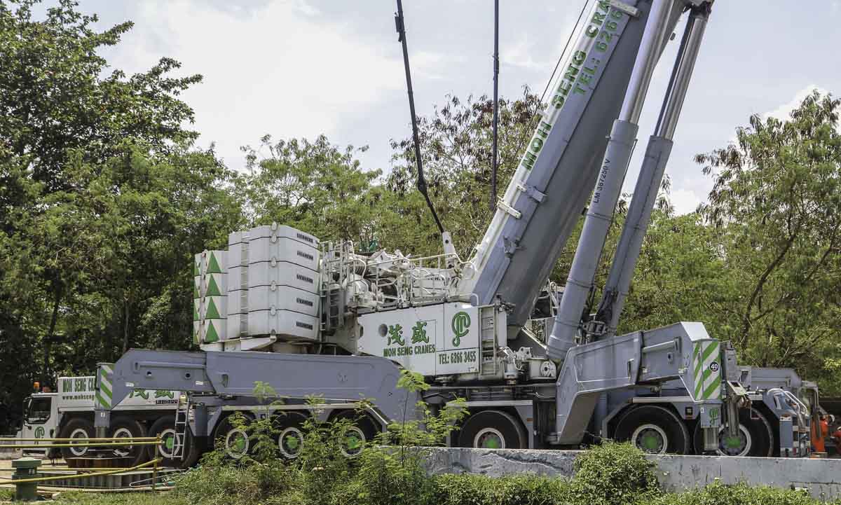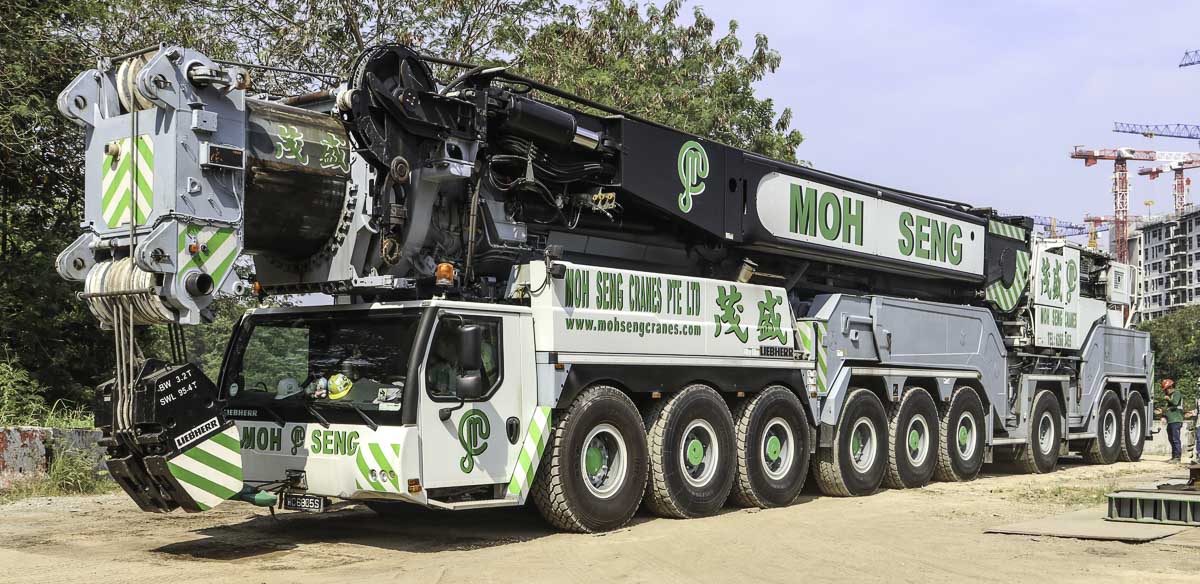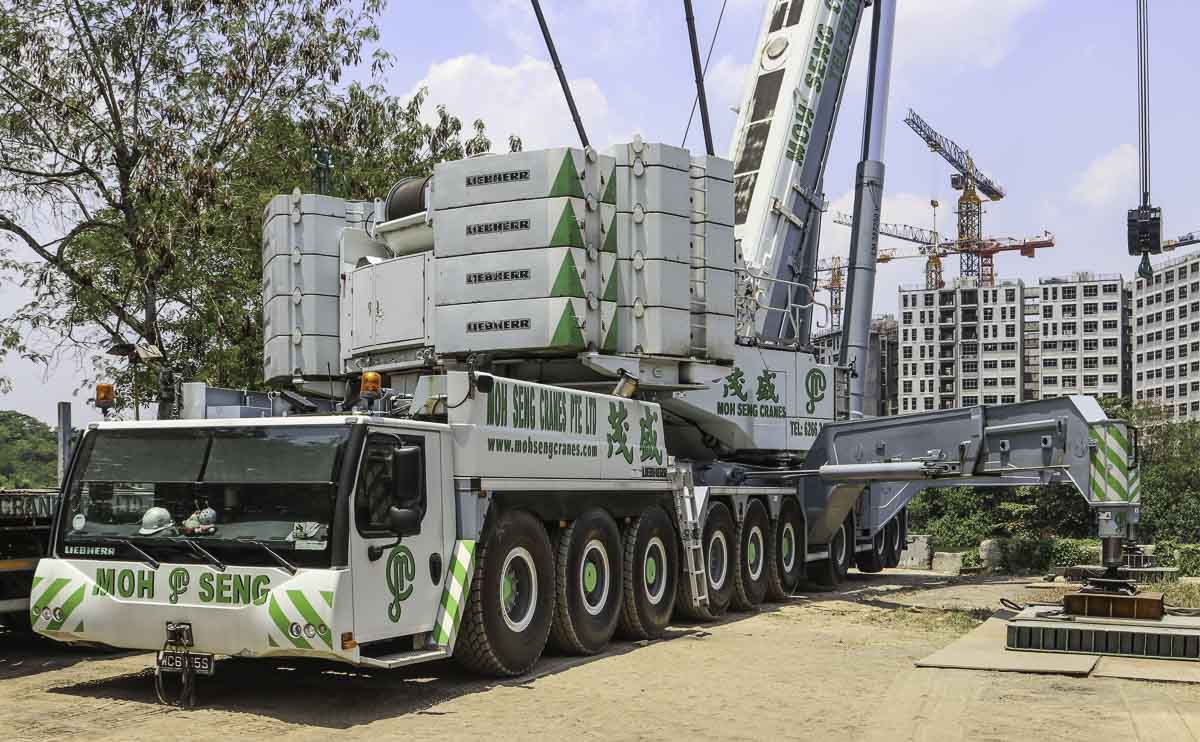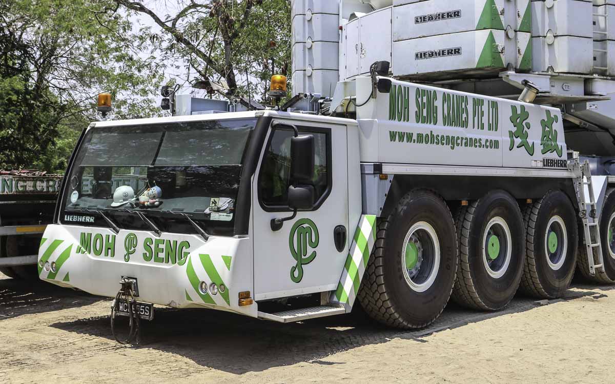 Der schöne Liebherr LTM 1750-9.1 von Moh Seng aus Singapur (SG) sollte zum Heben mehrere Pontons eingesetzt werden. Hier ist der Kran bei seiner Ankunft auf der Baustelle zu sehen.
