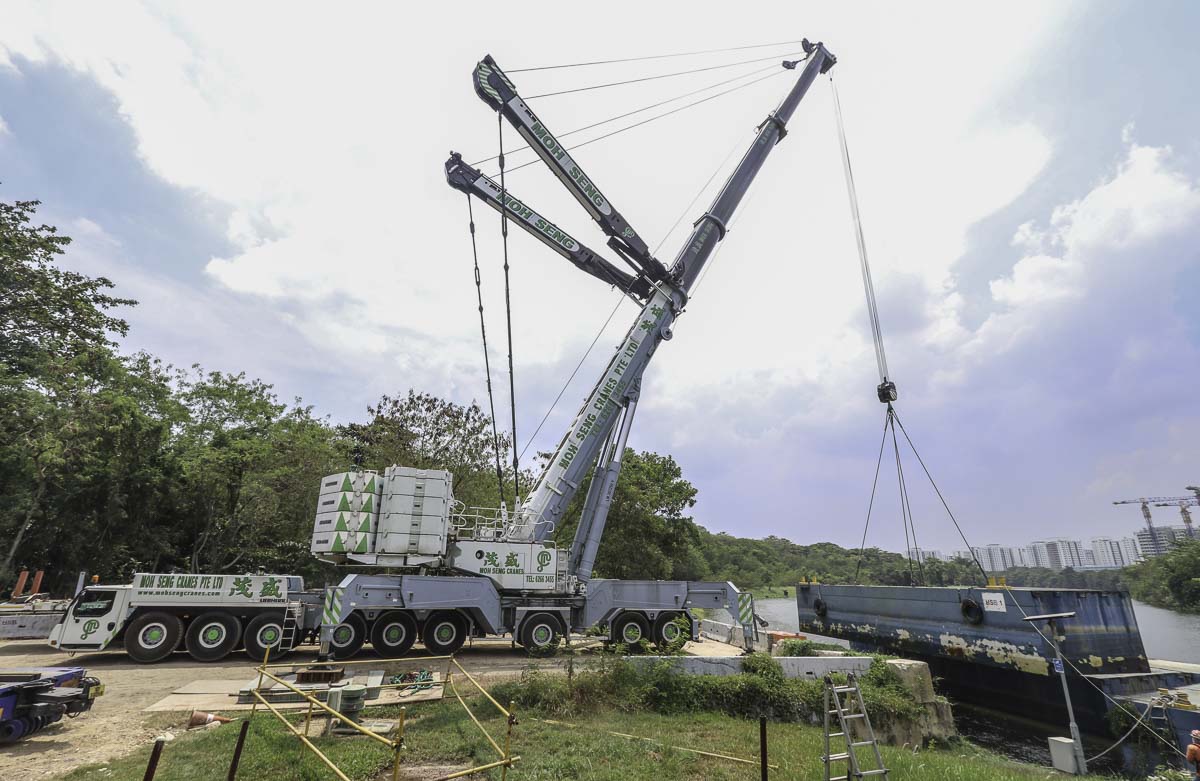 Der Kran musste mehrere Pontons aus dem Wasser heben. Ich habe zuvor am selben Ort den gleichen Einsatz des Liebherr LTM 1750-9.1 von Bok Seng beobachtet.
