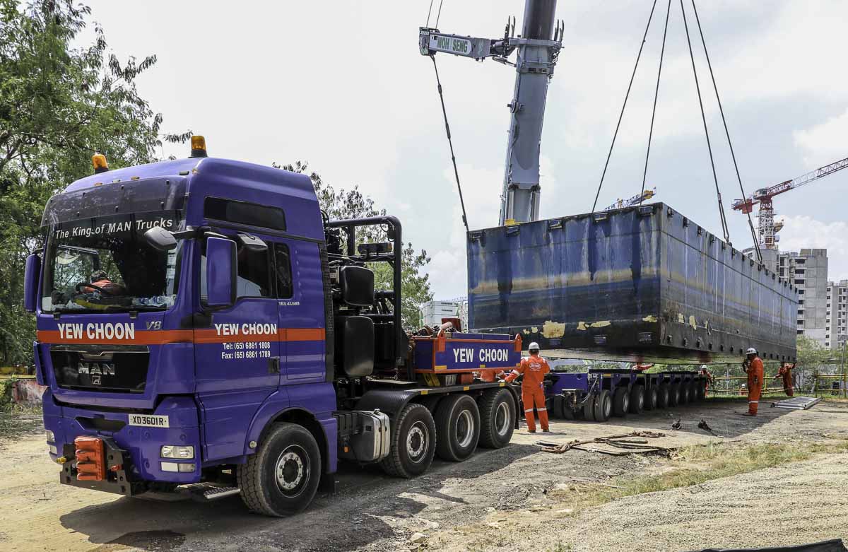 Die Pontons werden auf Yew Choon-Kombinationen verladen, die diesen schönen MAN TGX 41.680 mit einem 9-achsigen modularen Anhänger. Der Transport auf öffentlichen Straßen erfolgte erst am Abend.