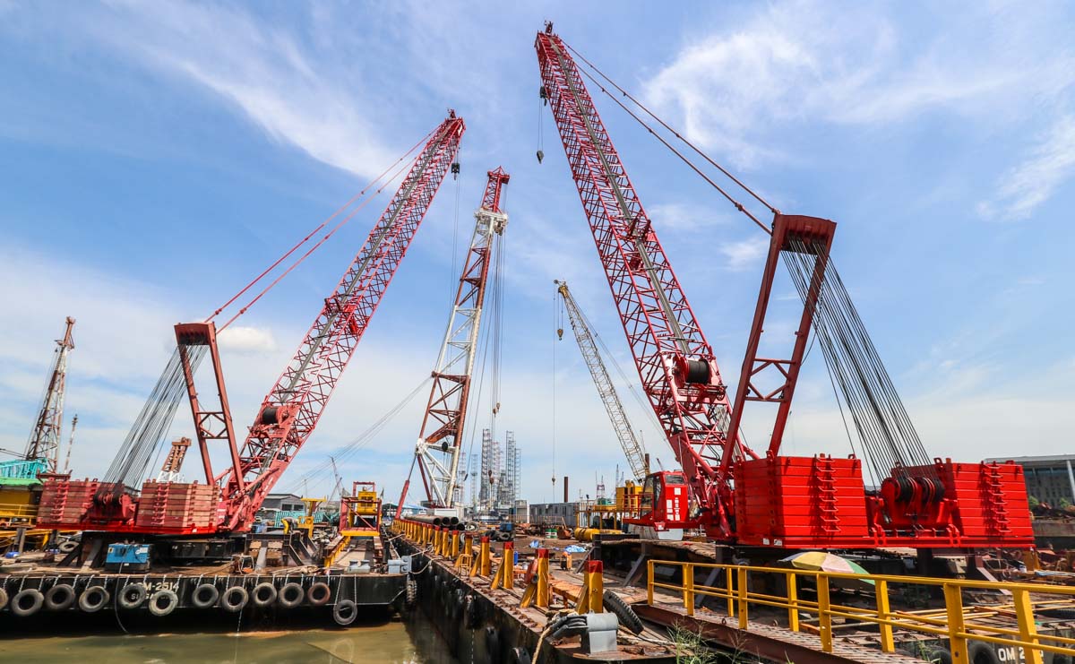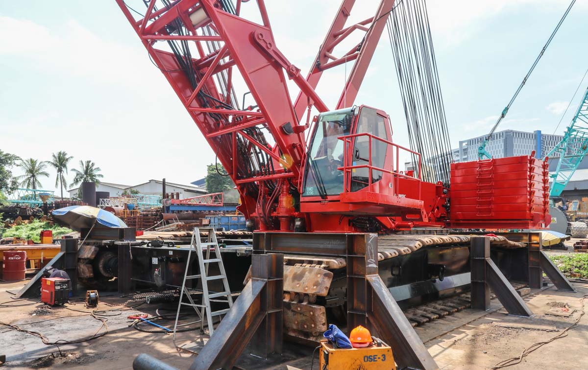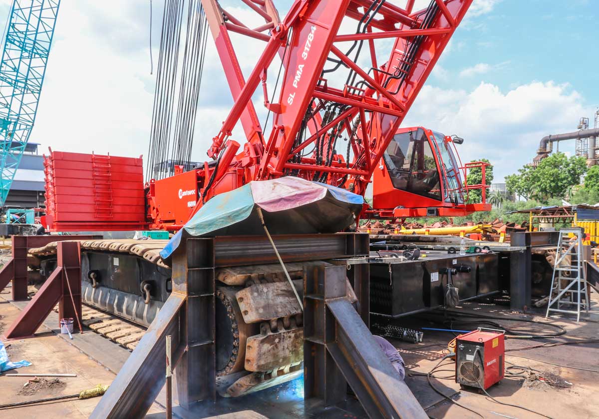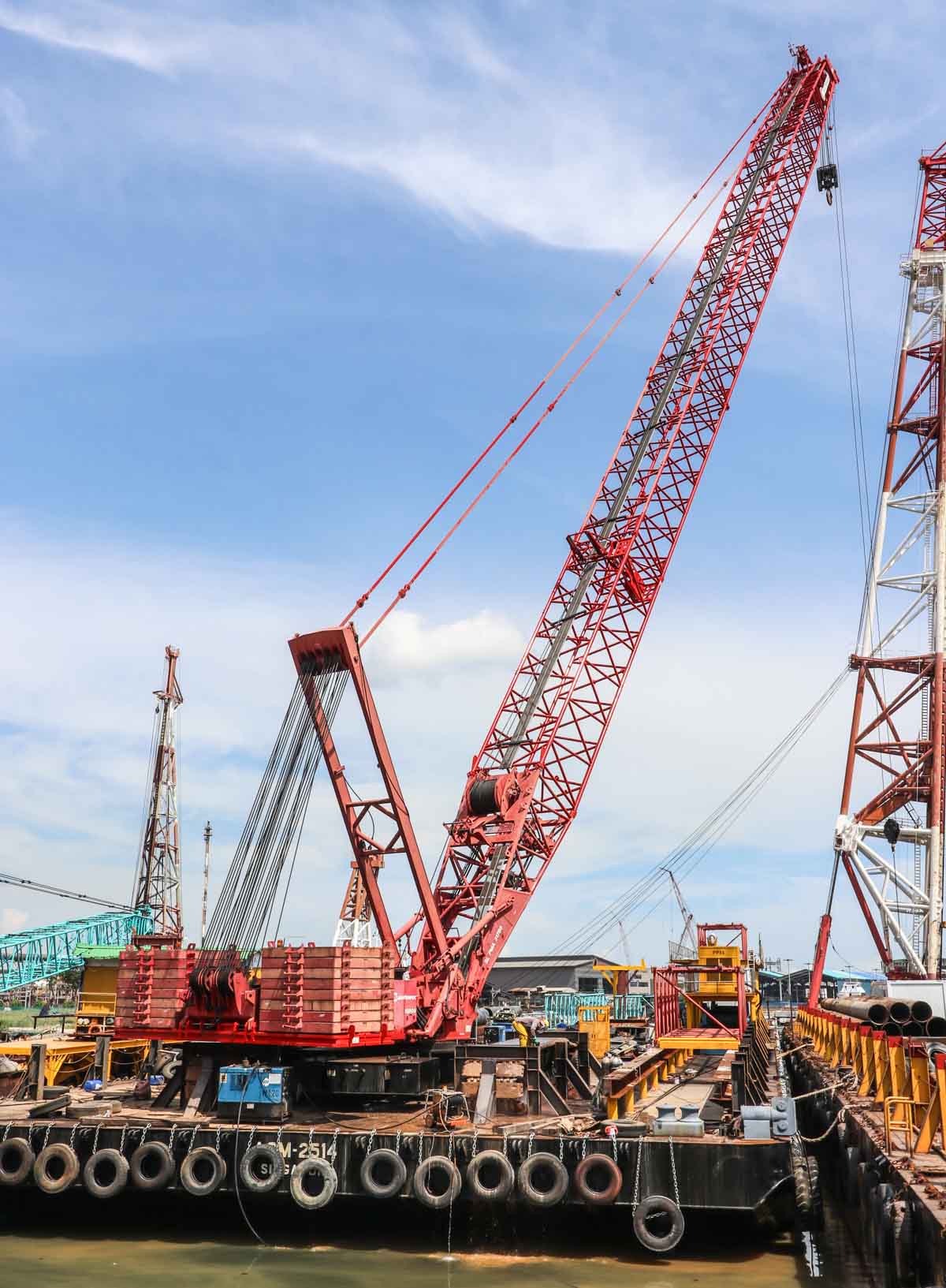 Im Jahr 2021 nahm Antara Koh aus Singapur (SG) direkt zwei dieser interessanten Manitowoc 16000 Raupenkrane in Betrieb. Beide Krane kamen gebraucht aus Malaysien und stammen aus dem Baujahr 2007. Jeder Kran wurde auf einem Ponton aufgebaut und für ein großes Projekt vor der afrikanischen Küste vorbereitet.