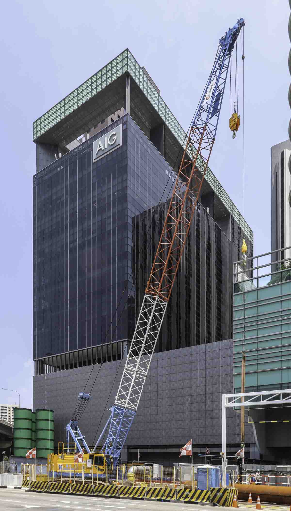 Dieser beeindruckende Manitowoc 11000-1 von Huationg (Asia) - jetzt Denzai - wurde auf einer kleinen Baustelle im Zentrum von Singapur (SG) eingesetzt. Es handelt sich um einen 100-Tonnen-Raupenkran.
