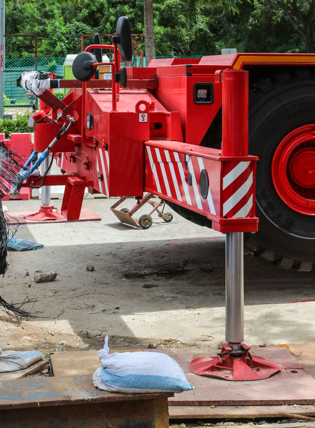 An der Oberwagen ist ein Ballastgewicht von 9,5 Tonnen montiert, das einen Drehkreis von 4,5 Metern hat. Beide 8-Tonnen-Hubwinden sind hier im Einsatz.