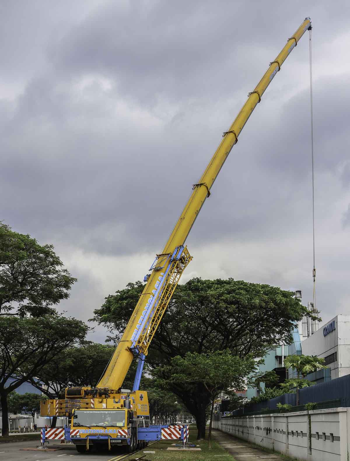 Dieser eindrucksvolle Terex AC 250-1 gehört zu Huationg (Asia) aus Singapur (SG) und wurde an einem Wochenende für Hebearbeiten in einer Fabrik eingesetzt. Es handelt sich um einen 250-Tonnen-Teleskopkran, montiert auf einem 6-achsigen Unterwagen.