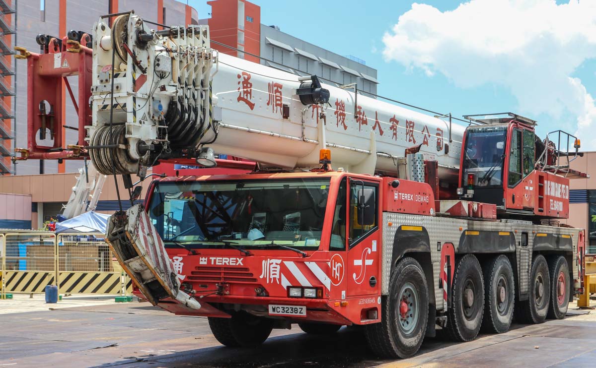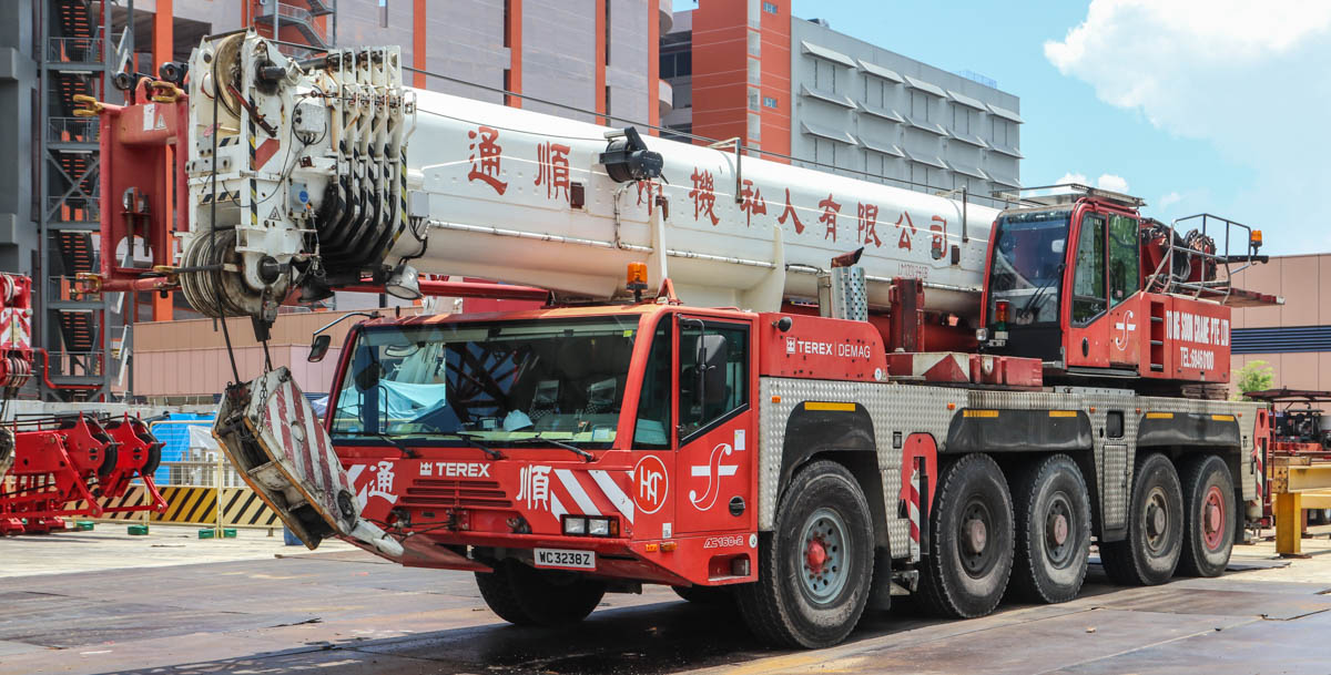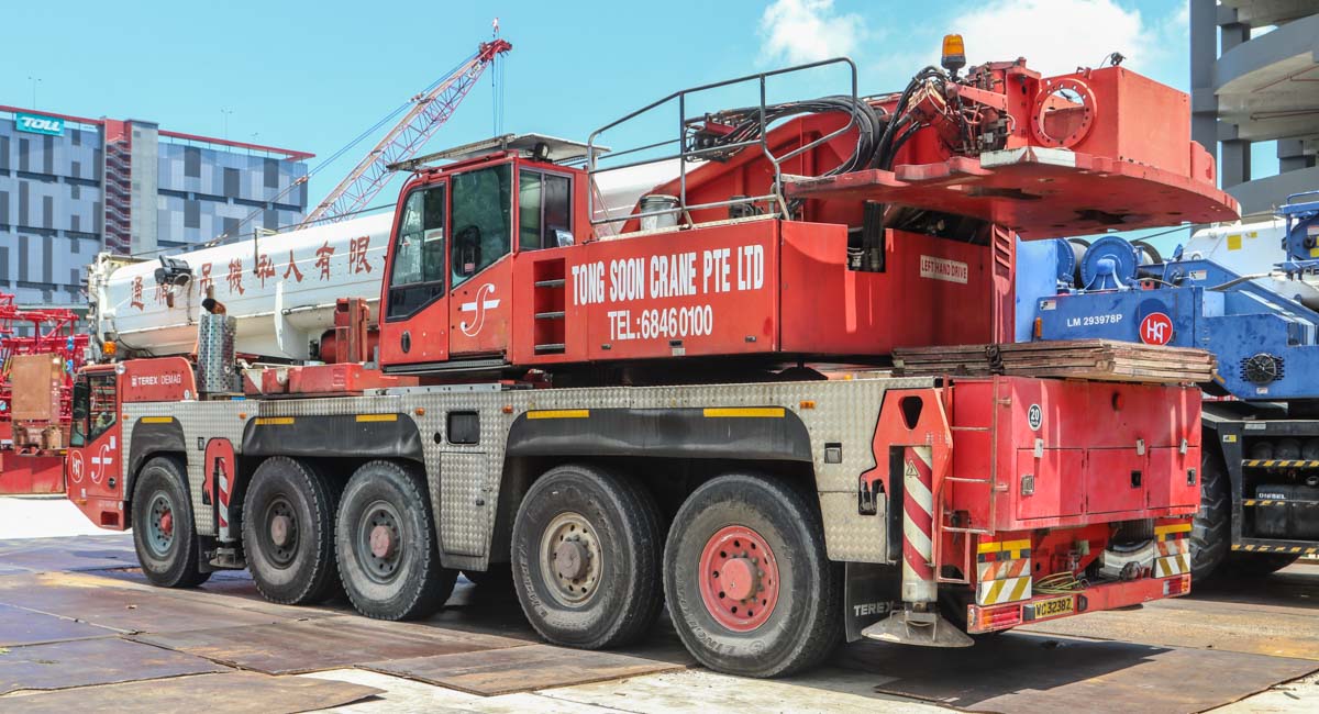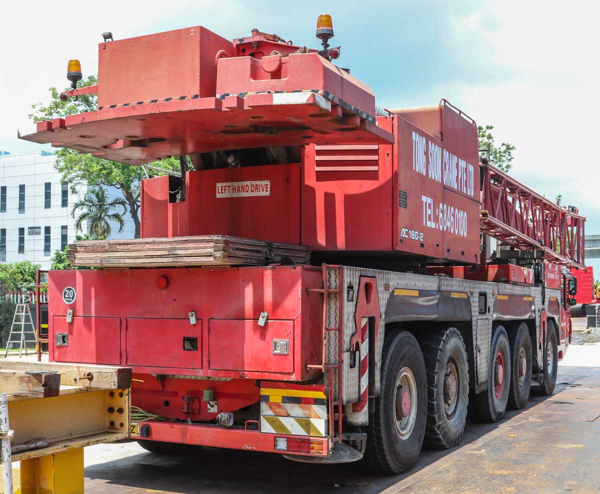 Dieser wunderschöne Terex AC 160-2 gehört Hup Hin aus Singapur (SG). Der Kran trägt die Namen und Farben von Tong Soon Crane, ebenfalls aus Singapur, ein Unternehmen, das von Hup Hin übernommen wurde. Es handelt sich um einen 160-Tonnen-Kran, der auf einem 5-achsigen Unterwagen montiert ist.