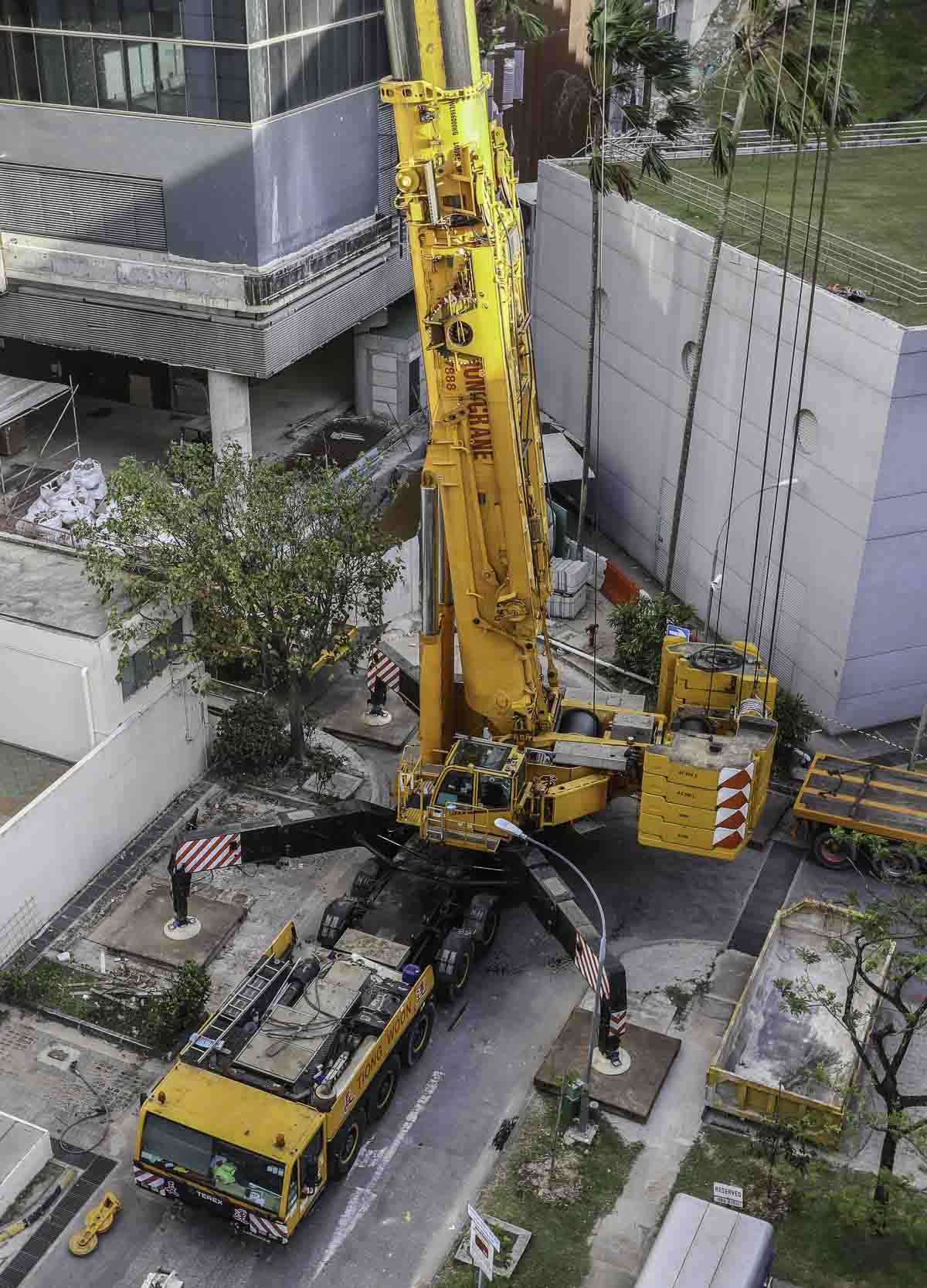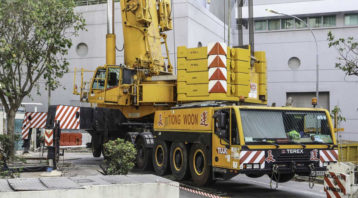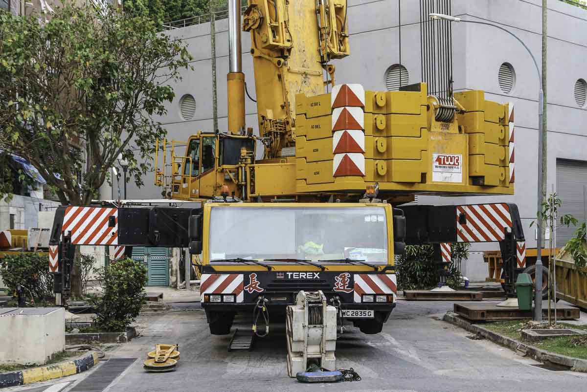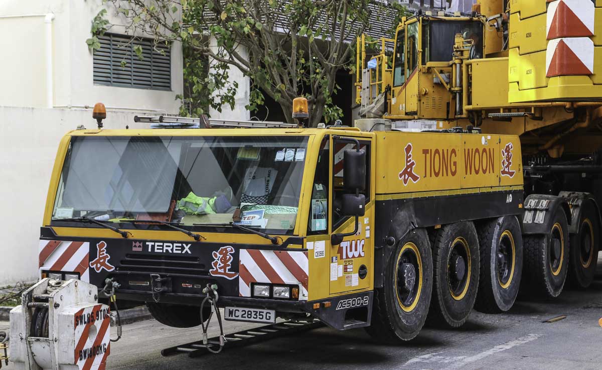 Dieser sehr schöne Terex AC 500-2 von Tiong Woon aus Singapur (SG) wurde an einem Sonntag zum Heben von Baumaterialien auf das Dach eines Gebäudes eingesetzt. Es handelt sich um einen 500-Tonnen-Kran mit einem 8-Achs-Unterwagen. Beide Liebherr LTM 1500-8.1 von Moh Seng waren zuvor auf derselben Baustelle im Einsatz.