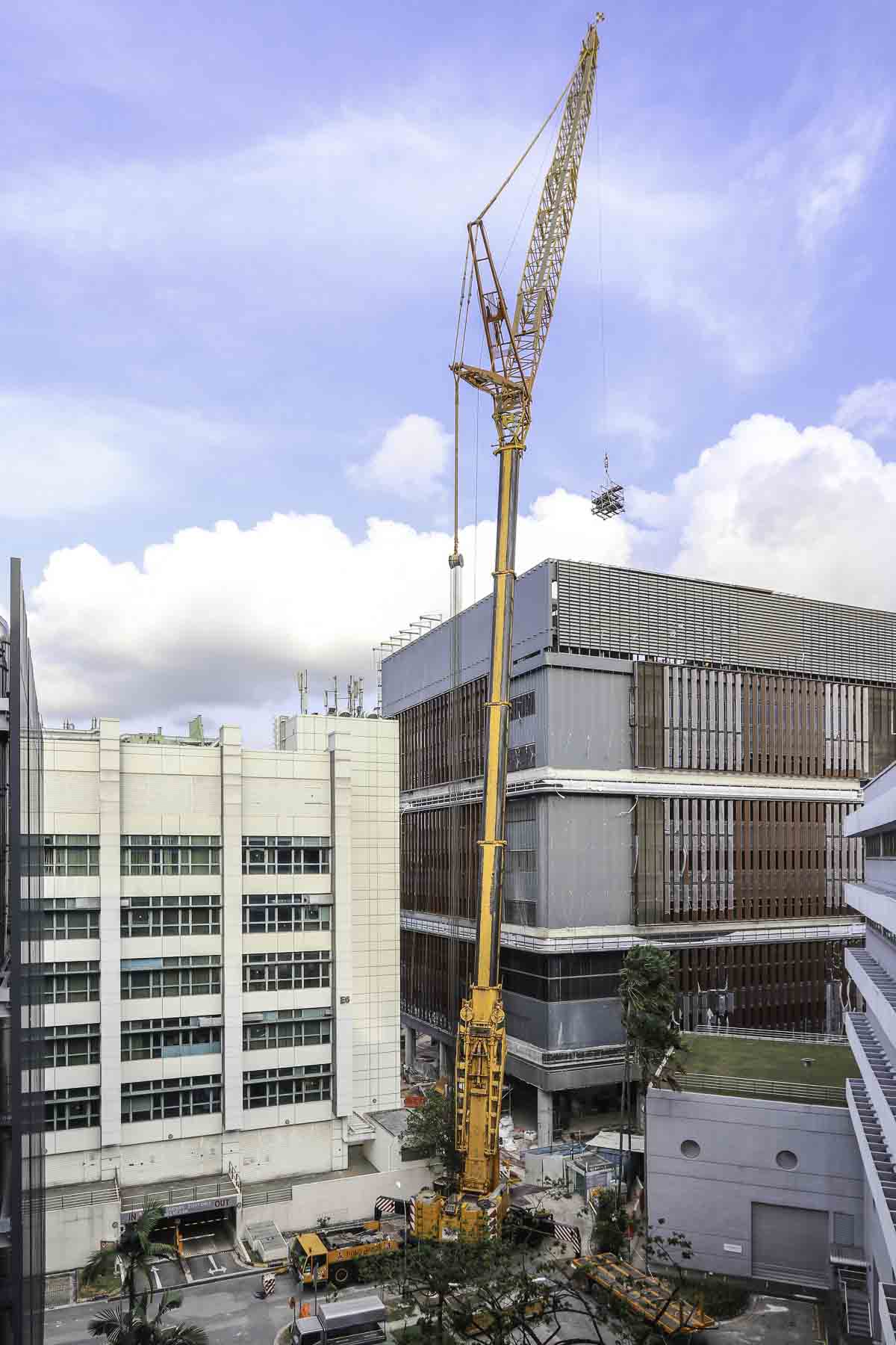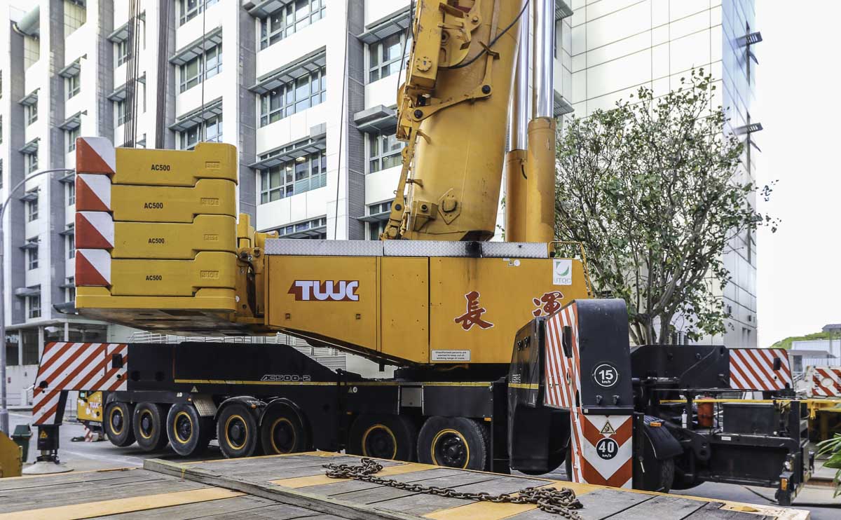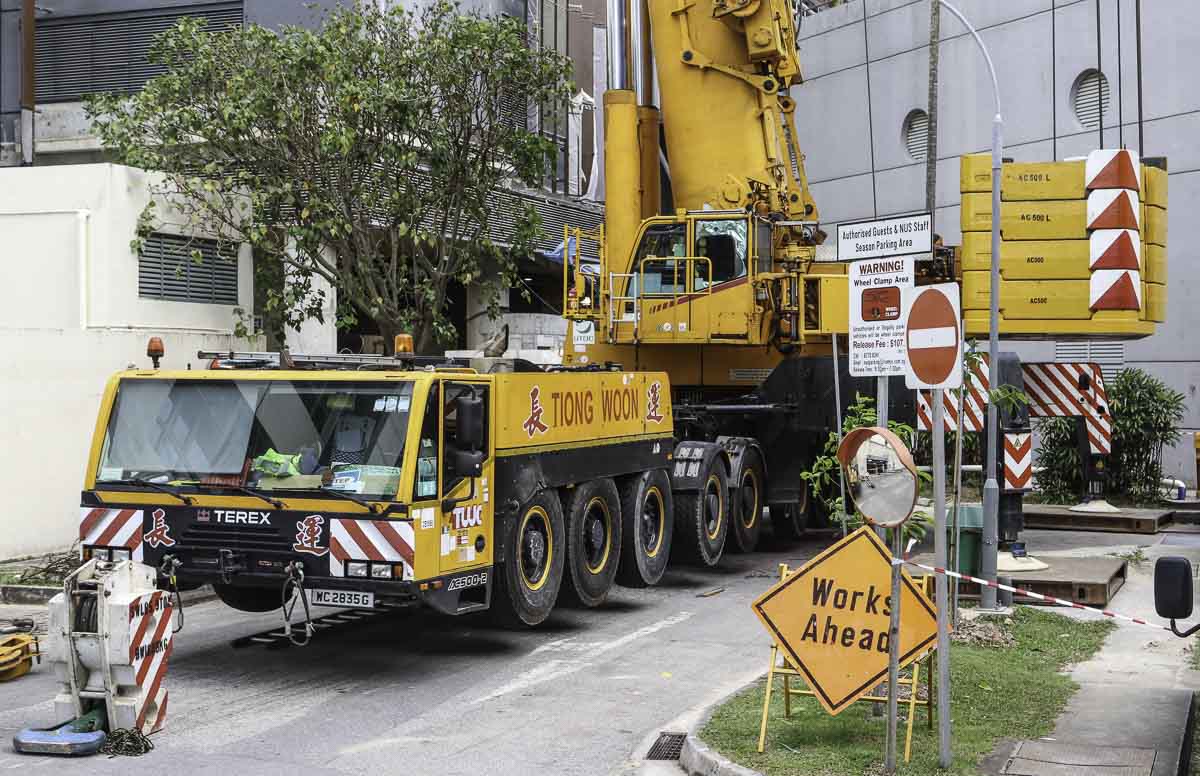 Dieser sehr schöne Terex AC 500-2 von Tiong Woon aus Singapur (SG) wurde an einem Sonntag zum Heben von Baumaterialien auf das Dach eines Gebäudes eingesetzt. Es handelt sich um einen 500-Tonnen-Kran mit einem 8-Achs-Unterwagen. Beide Liebherr LTM 1500-8.1 von Moh Seng waren zuvor auf derselben Baustelle im Einsatz.