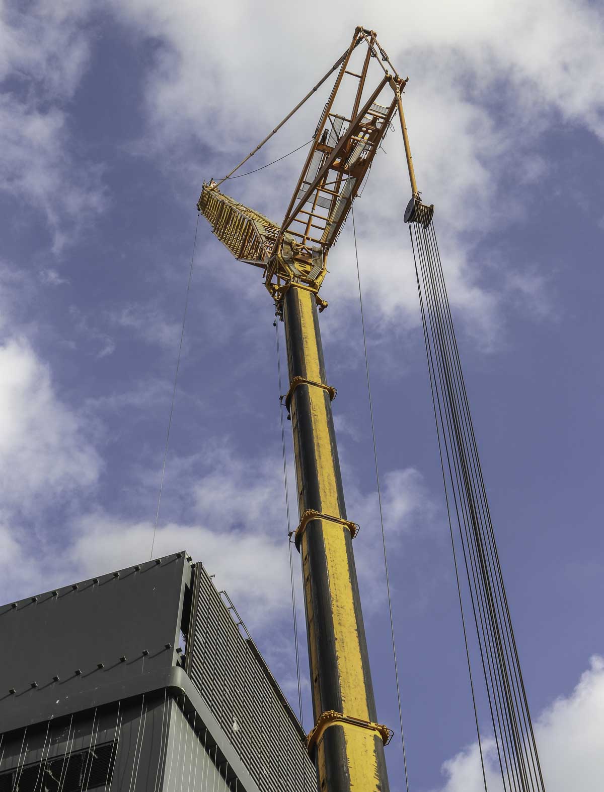 Hier wurde der Hauptausleger auf eine Länge von 51,8 Metern ausgefahren, der wippbare Hilfsausleger hat eine Länge von 60 Metern.