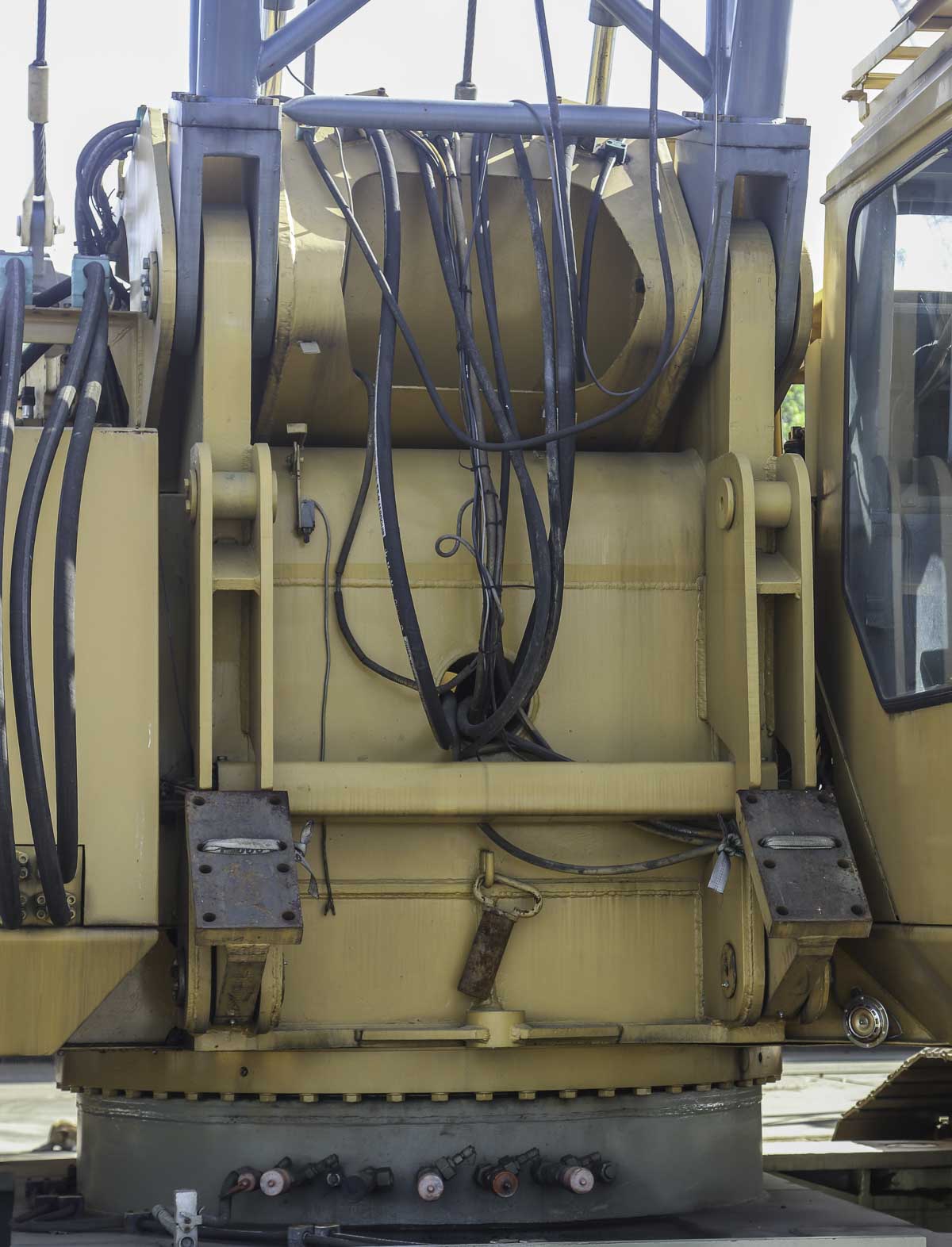 Mit diesem kurzen Hauptausleger kann der Raupenkran beispielsweise unter Brücken oder Viadukten eingesetzt werden. Dies ist im Tunnelbau häufig der Fall. Zwei Winden wurden eingeschert, jede Seite verfügt über eine eigene Winde, was beispielsweise das einfache Wenden von Teilen ermöglicht.