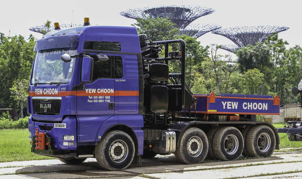 Für den Transport einer Dampflokomotive setzte Yew Choon aus Singapur (SG) diesen schönen MAN TGX 41.680 mit 6-Achs-Anhänger ein. Im frühen Morgen ist die Kombination vor dem bekannten Marina Bay Sands Hotel geparkt und soll demnächst entladen werden.