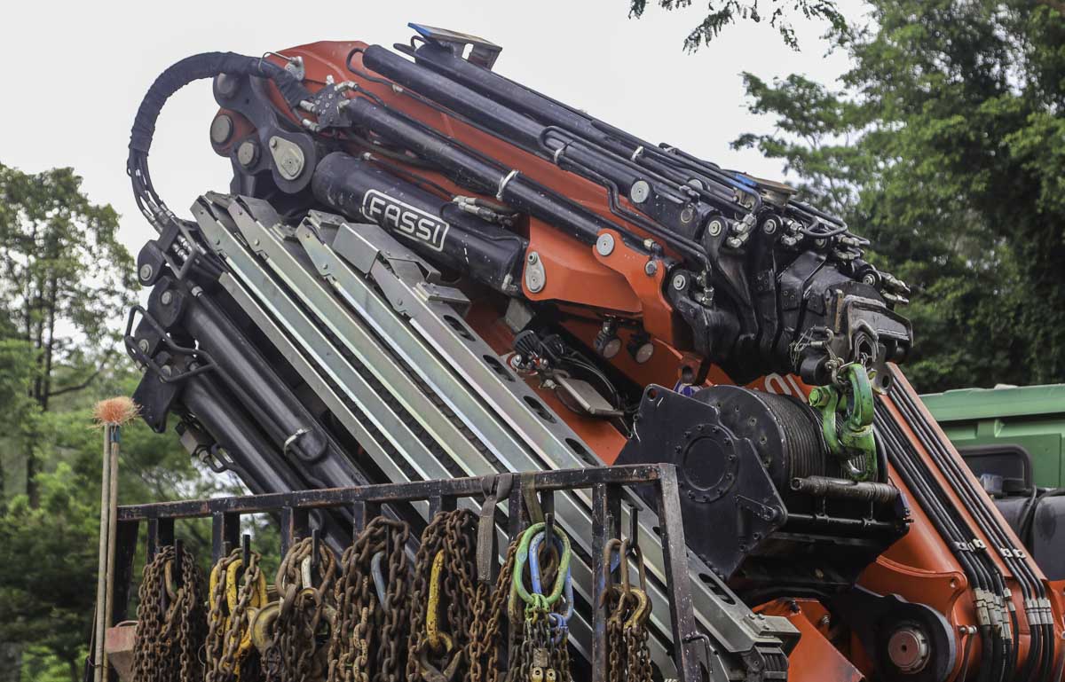 Hinter der Kabine ist der Fassi F2150RA Ladekran montiert. Dieser Kran kann maximal 30 Tonnen bis 4,75 Metern oder 2,25 Tonnen bis 26,8 Metern heben. Die Stützen neben dem Kran fahren bis zu einer Breite von 11 Metern aus.
