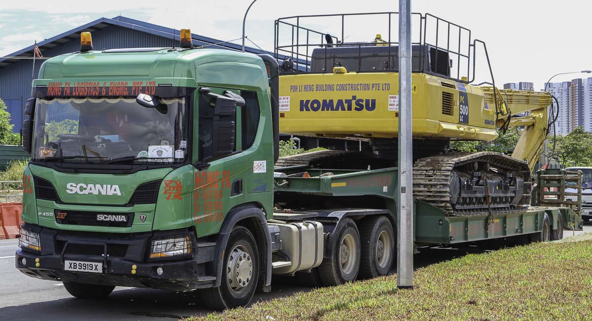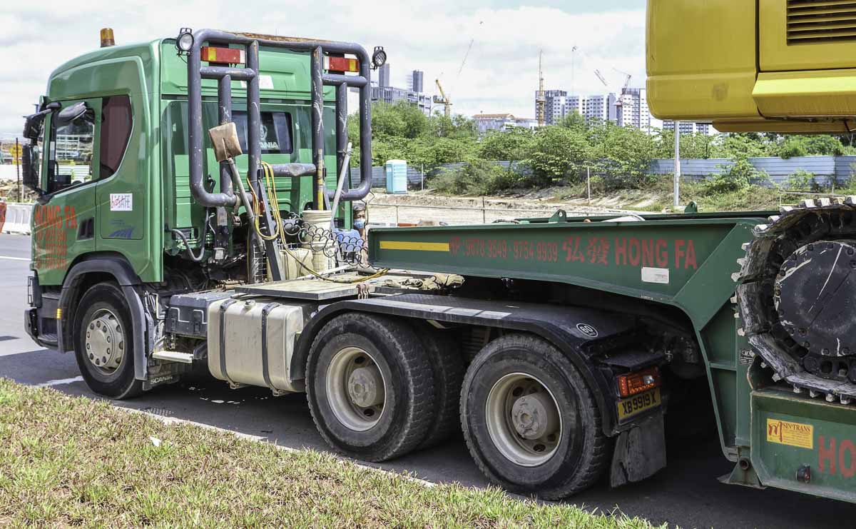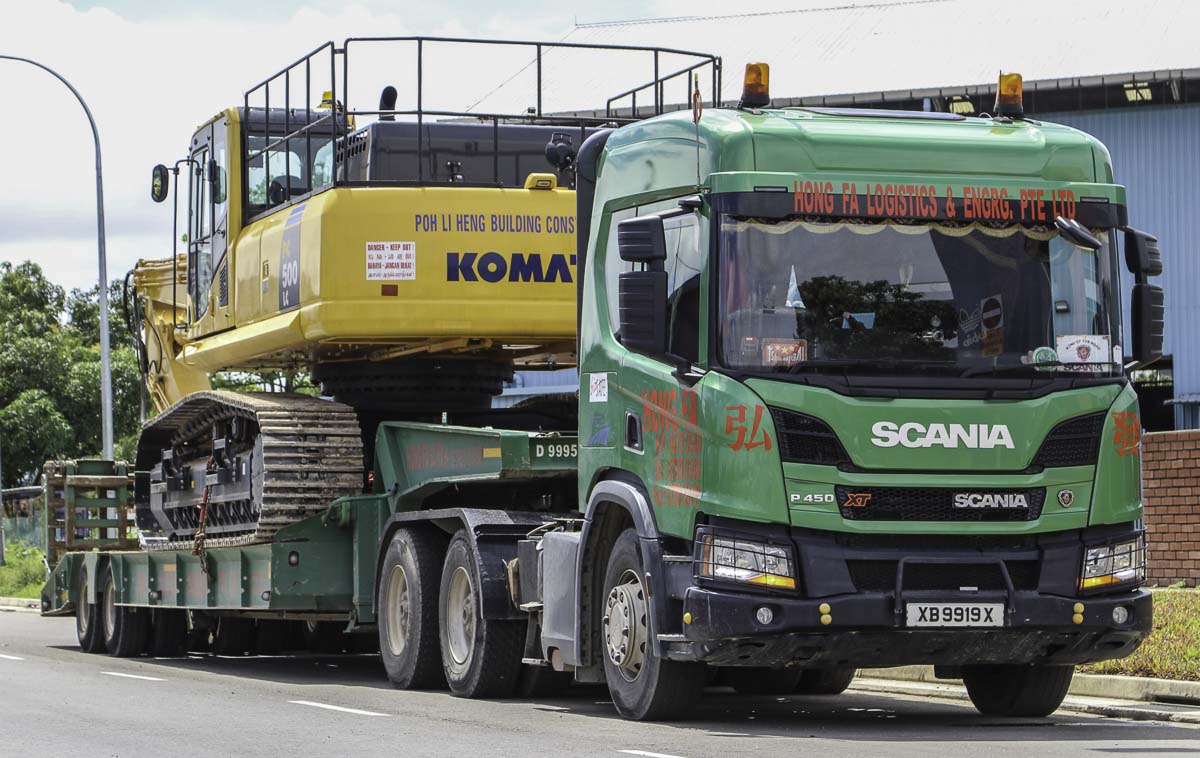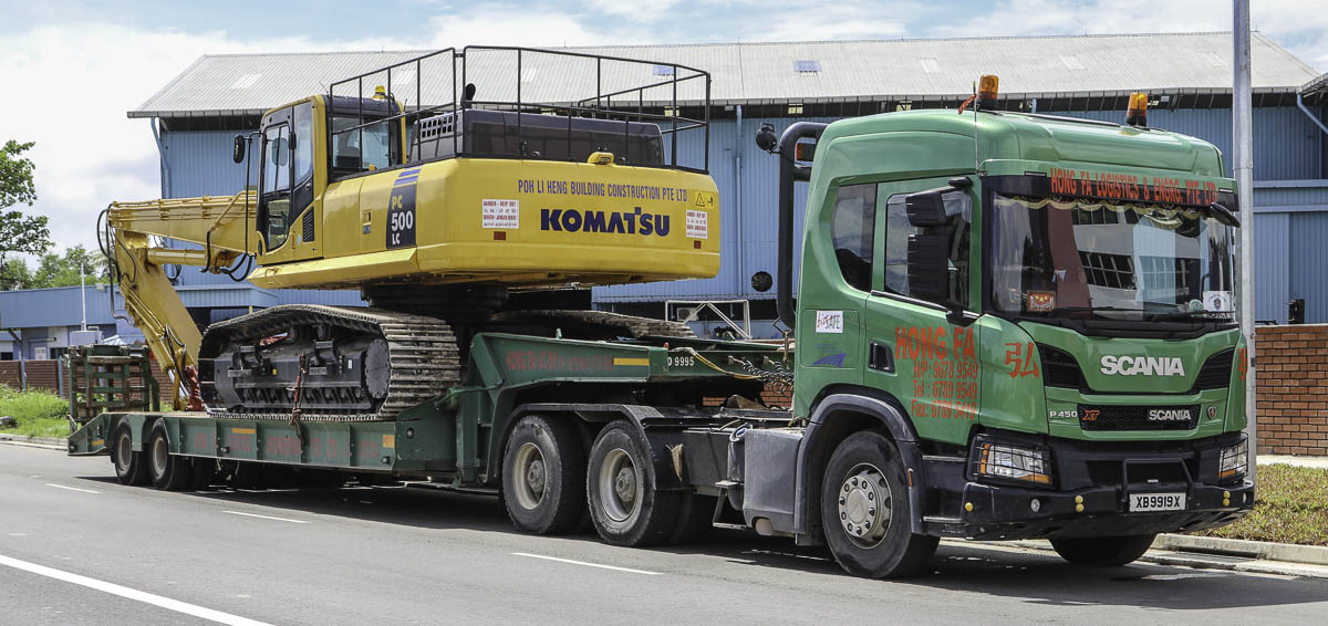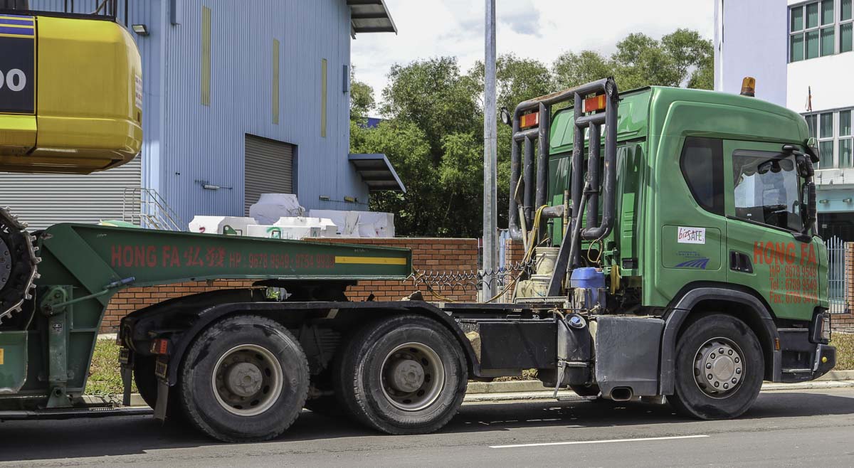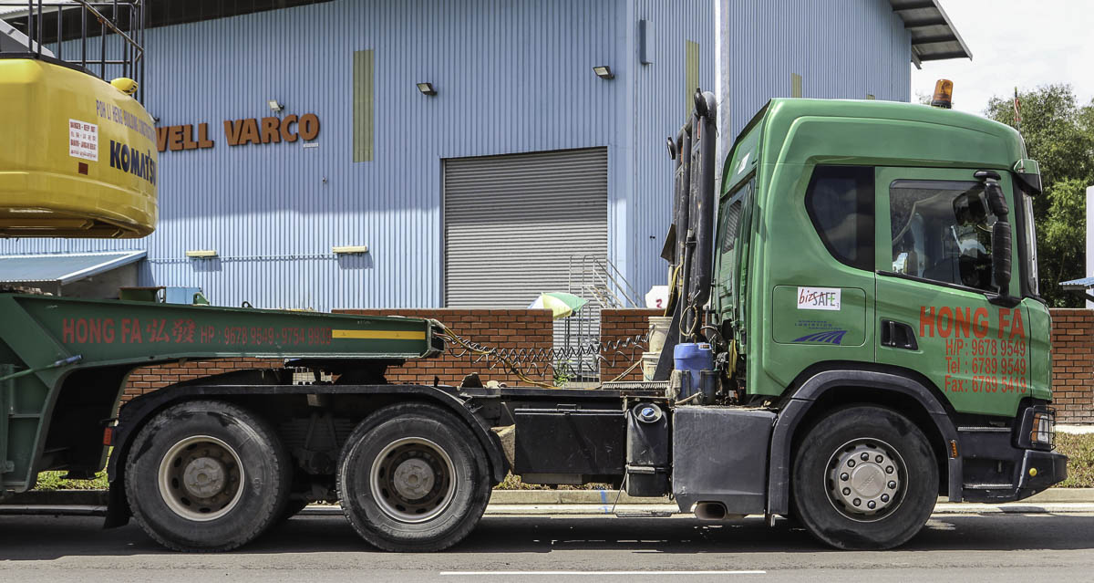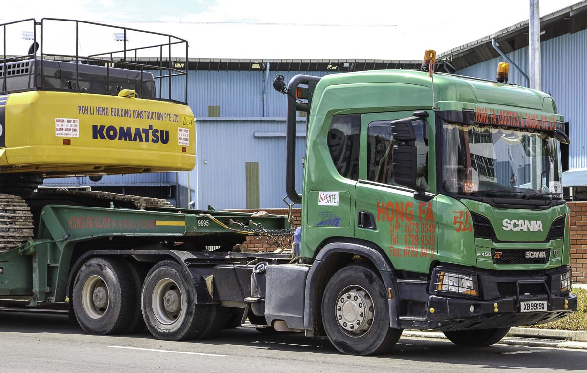 Dieser schöne Scania P 450 ist von Hong Fa aus Singapur (SG) und war mit einem 2-Achs-Tieflader unterwegs. Hong Fa betreibt auch mehrere Fahrzeugen mit schweren Ladekranen.