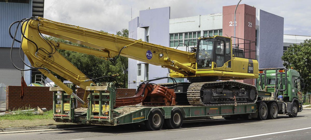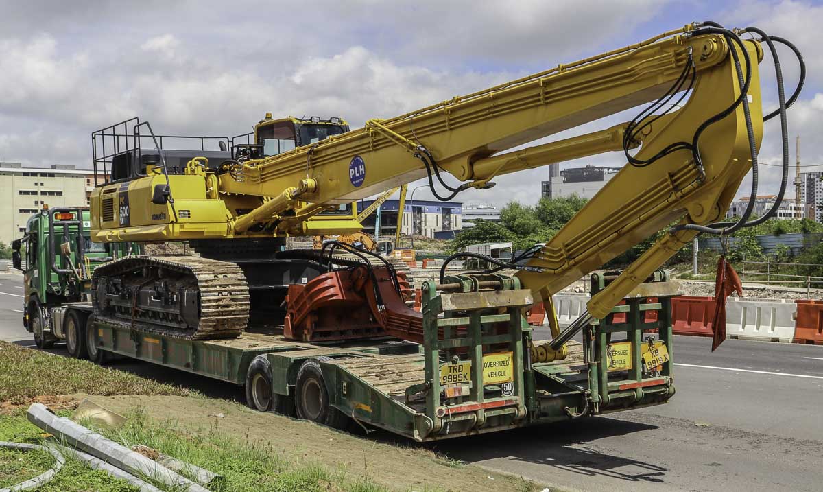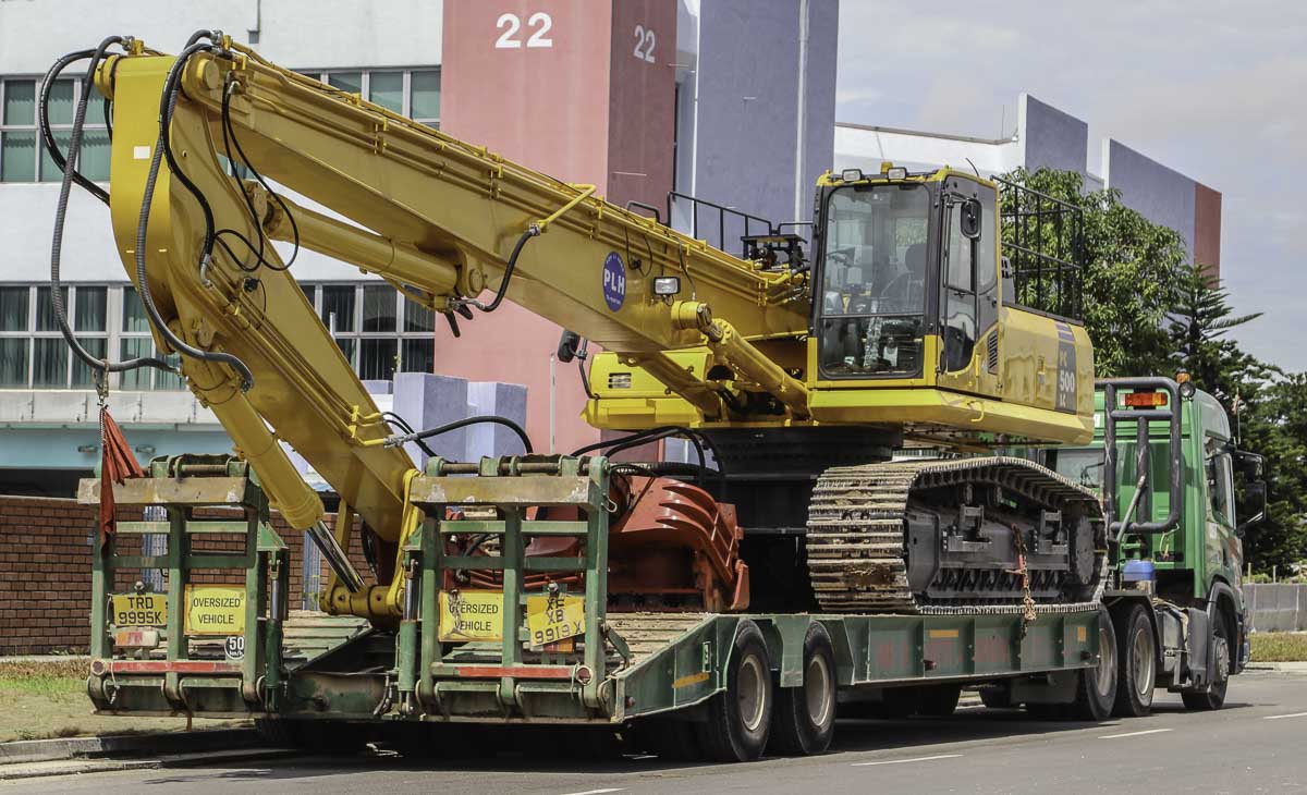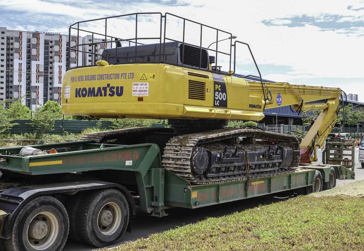 Die Ladung ist ein Komatsu PC500LC Spundwandmachine mit einem Gewicht von ca. 60 Tonnen.