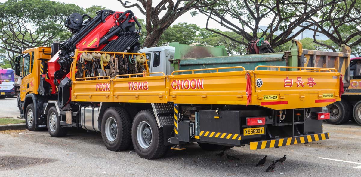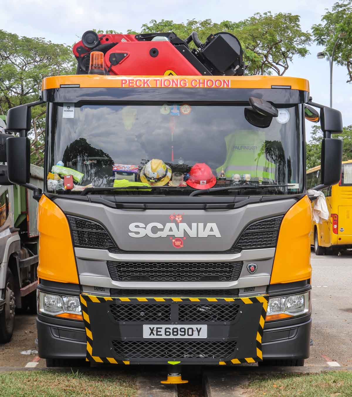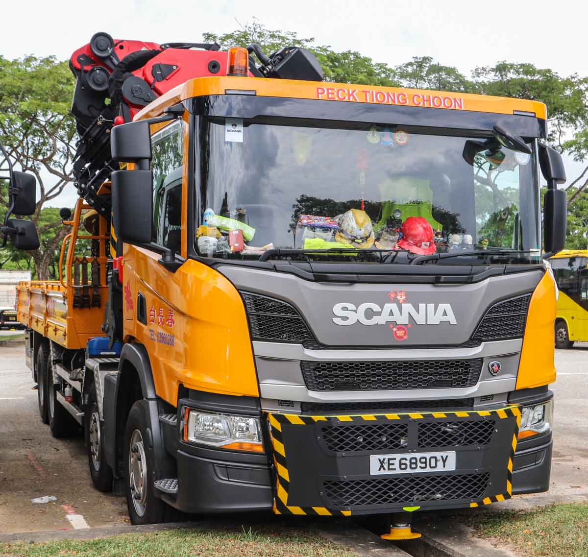 Dieser schöne Scania P 450 ist von Peck Tiong Choon aus Singapur (SG). Es ist ein vierachsiger Pritschenwagen, der mit einem schweren Ladekran ausgeführt ist. Das Fahrzeug stand hier während eines Wochenendes auf einem Parkplatz für schwere Fahrzeuge geparkt. Das Baujahr des Fahrzeugs ist 2021.