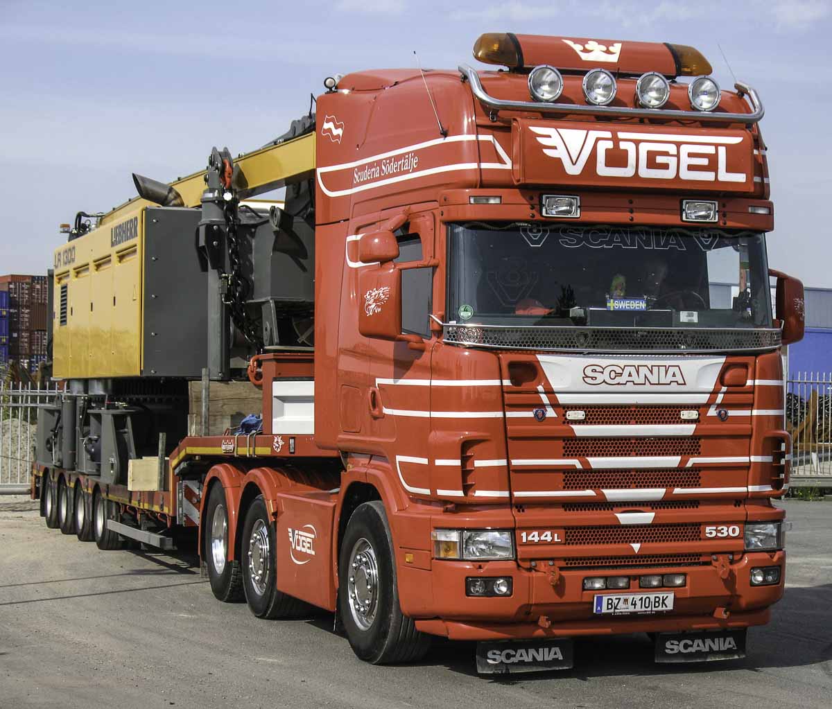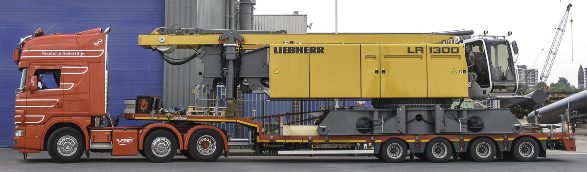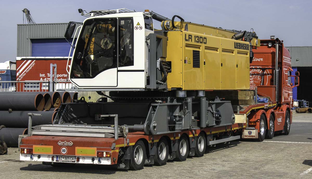 Dieser schöne Scania 144 L 530 von Vögel Transporte aus Bludesch-Gais (AT) kam das Grundgerät des neuen Liebherr LR 1300 für VEMA Crane aus Breda (NL) abliefern. Die Kombination besteht aus einer 3-Achs-Sattelzugmaschine mit einem 4-Achs-Auflieger.