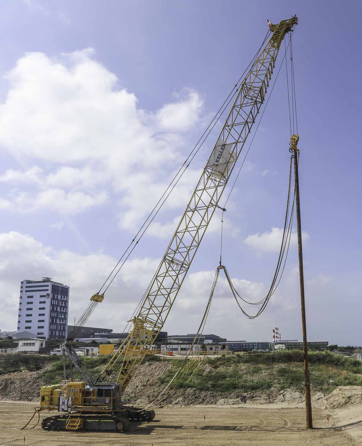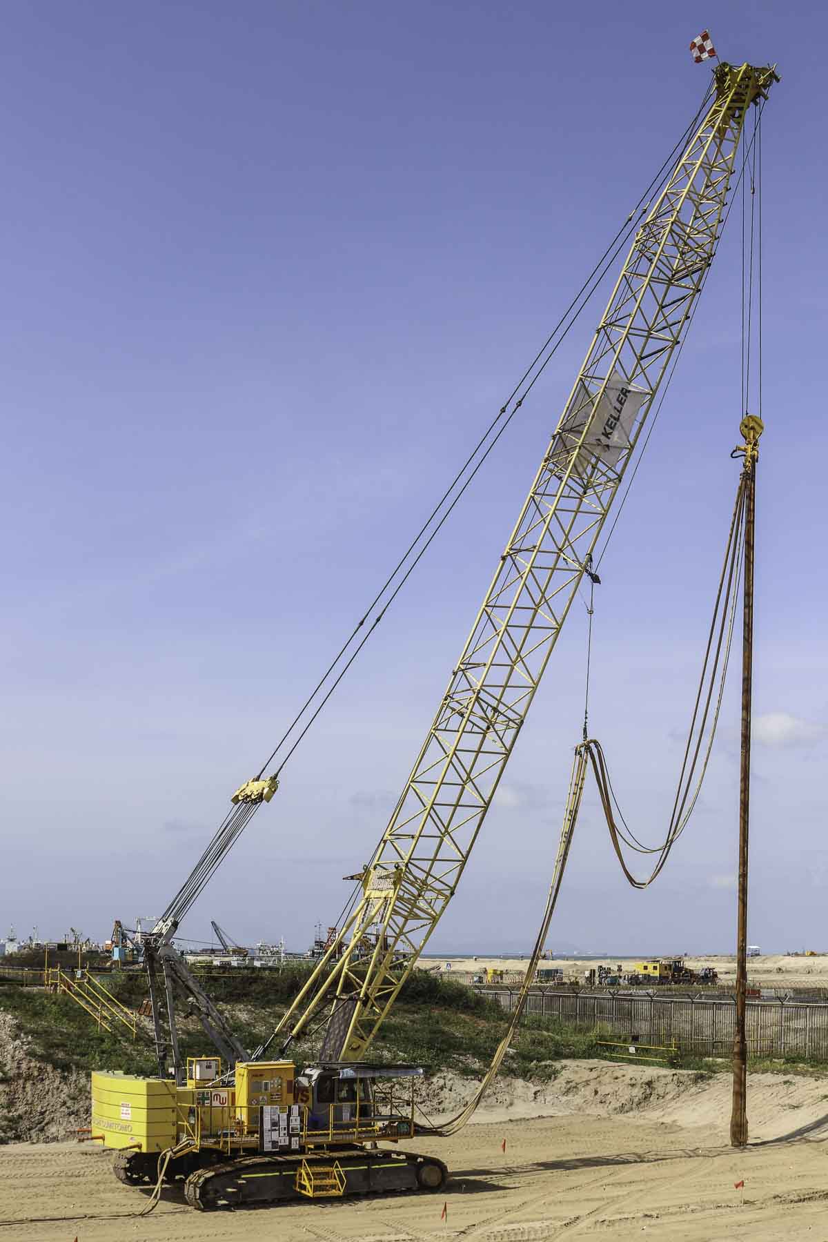 Der Kran hebt eine große Lanze, die mittels Vibration und Wasser in den Boden getrieben wird, um ihn zu verdichten.