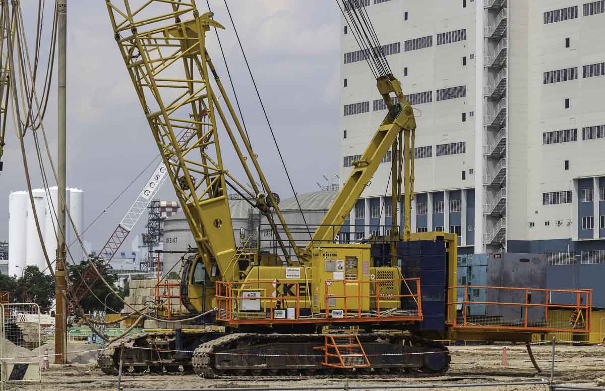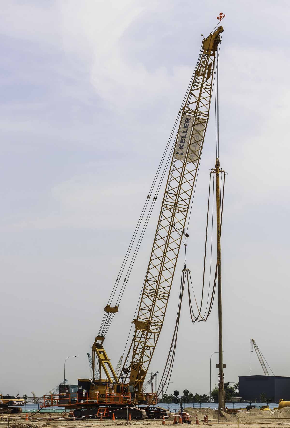 Dieser schöne Kobelco 7120S von Keller aus Singapur (SG) wurde auf einer Baustelle in Singapur für Rütteldruckverdichtung eingesetzt. Es handelt sich um einen 120-Tonnen-Raupenkran.