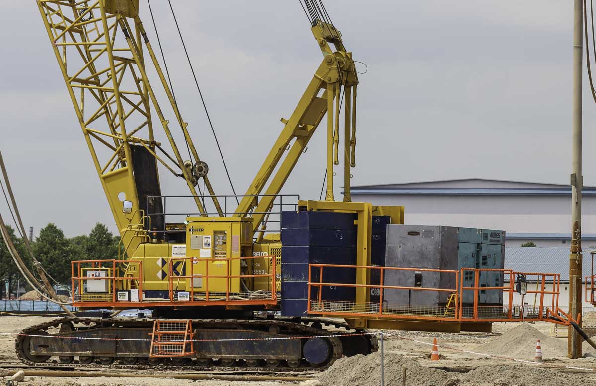 Im Kran hägt ein großer Rüttler der für die Verdichtung des Bodens verwendet wird. Das Ende der Lanze kann vibrieren, und senkt in den Boden. Durch das Rüttlen wird der Boden verdichtet.