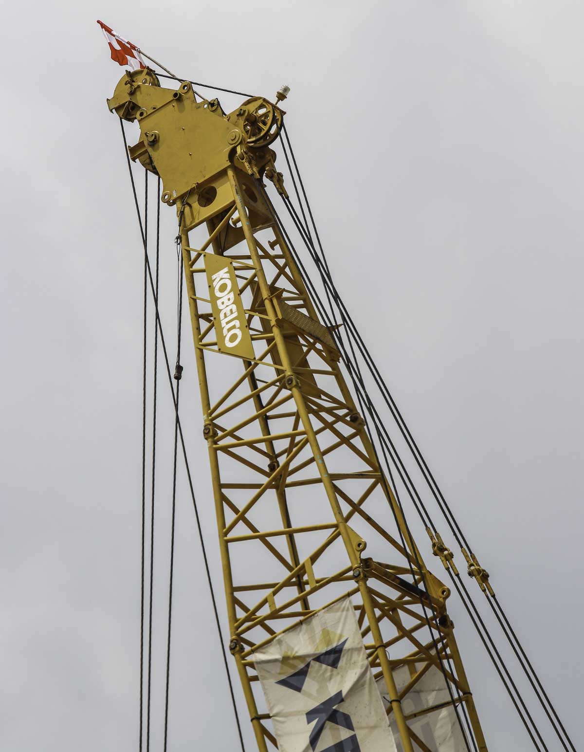 Der Kran ist hier mit einem 36,6 Meter langen Hauptausleger aufgebaut, die maximale Länge des Hauptauslegers ist 61 Meter.
