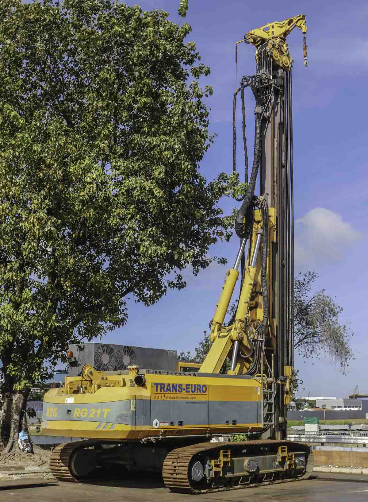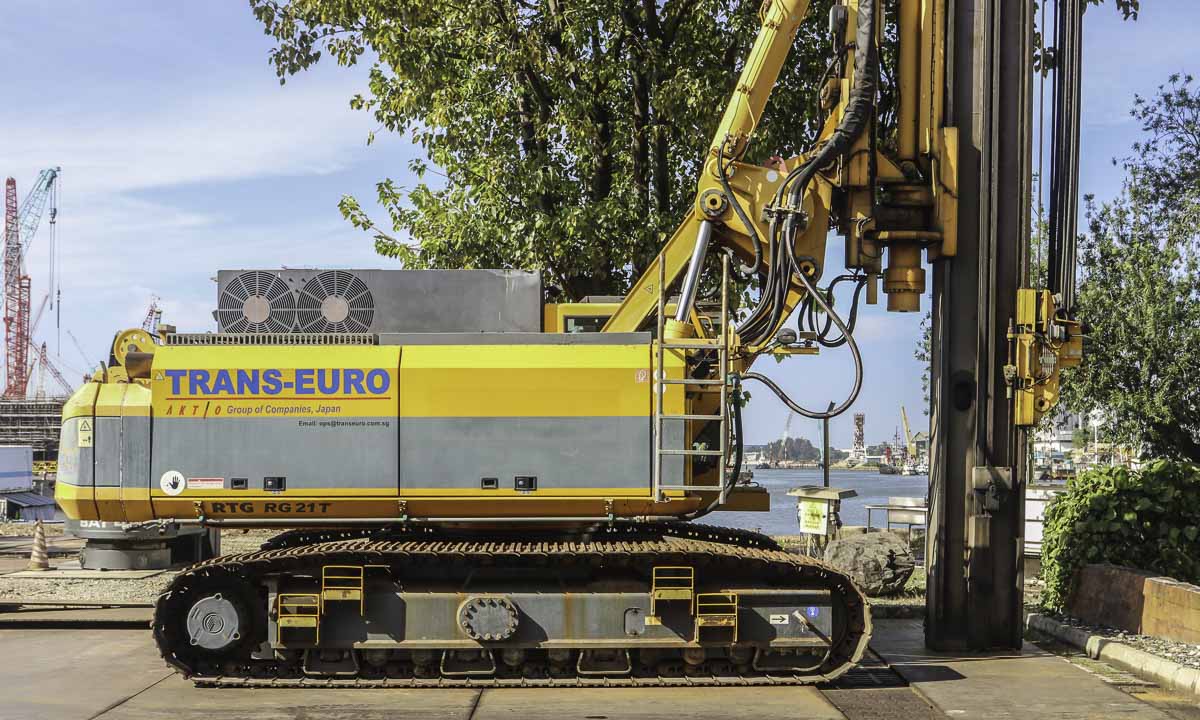 Dieser schöne und interessante RTG RG 21 T ist von Trans-Euro aus Singapur (SG) und stand auf dem Gelände geparkt. Es handelt sich um eine Spezialtiefbaumaschine mit einem ausfahrbaren Mäkler. Das Gerät hat ein Einsatzgewicht von ca. 71 Tonnen.