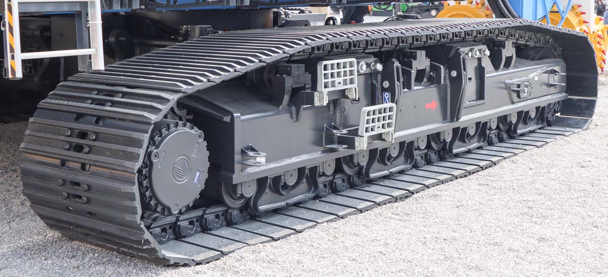 Die Maschine ist hier mit 29,5 Meter Hauptausleger aufgebaut und hat nun eine maximale Frästiefe von 52 Metern. Die maximale Frästiefe von 70 Metern kann nur erreicht werden mit einem 38,5 Meter-langen Hauptausleger. Die Arbeitsradius liegt zwischen 6,5 und 7 Metern.