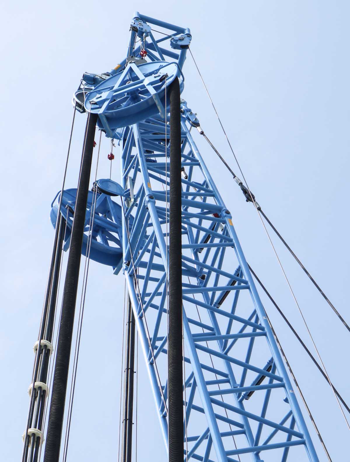 Der Hydromill wird über das Hubseil über das Ausleger-Kopfstück bewogen. Auf dem Kopfstück ist eine Brücke montiert mit zwei großen Umlenkungen für den Schlamm-Schlauch und die hydraulischen Leitungen.