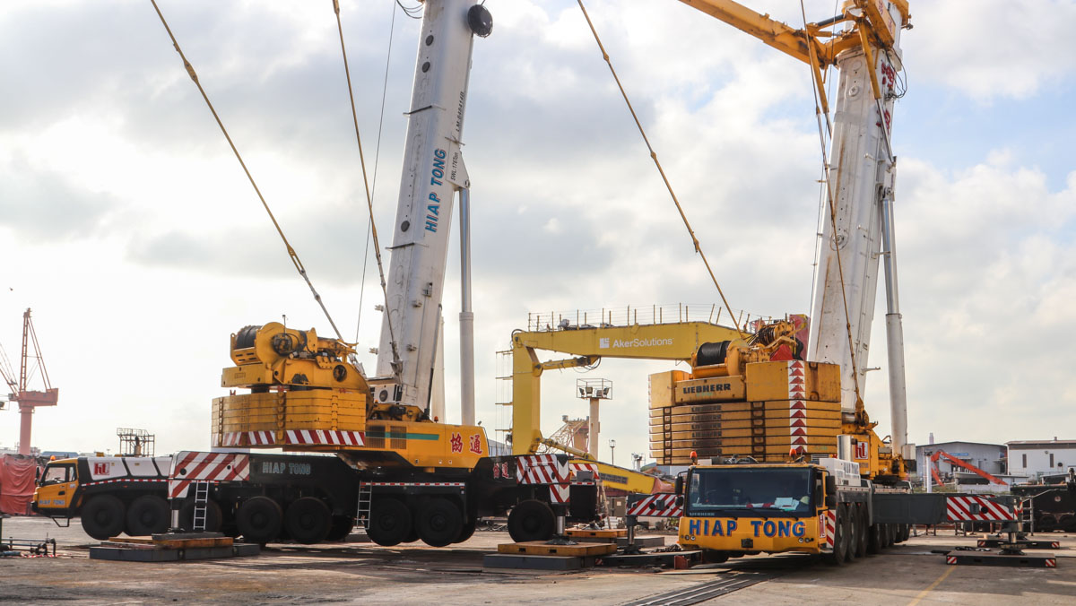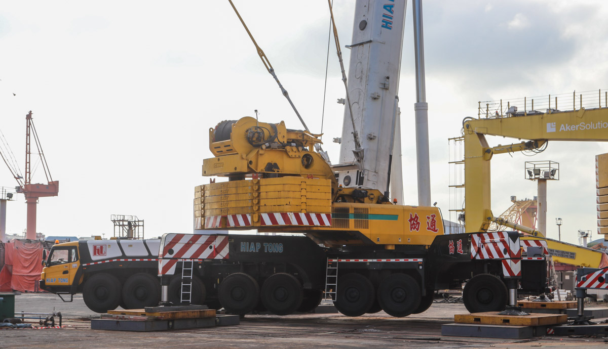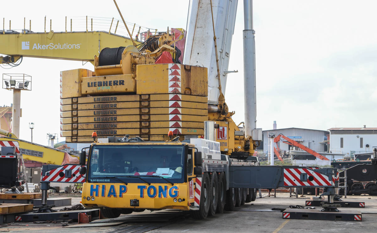 The telescopic cranes are all three from Hiap Tong of Singapore. They are the Grove GMK6300L, the Liebherr LTM 1500-8.1 and the Sany SAC6000.