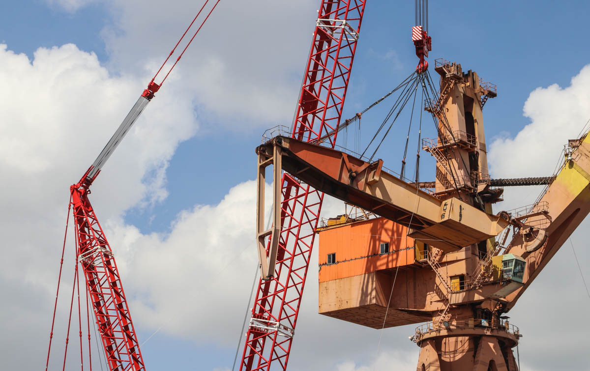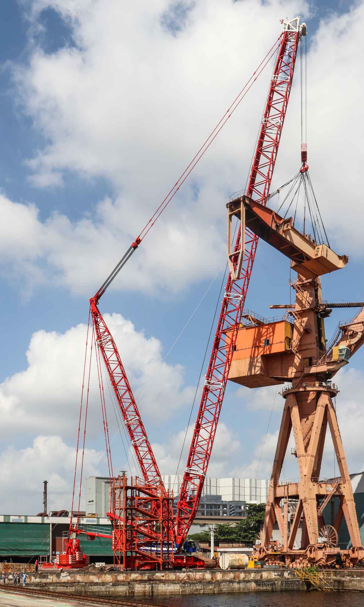 The two largest cranes, the 500-tonne and 600-tonne units, are attached to the boom of the wharf crane. The 300-tonne Grove serves as the auxiliary crane.