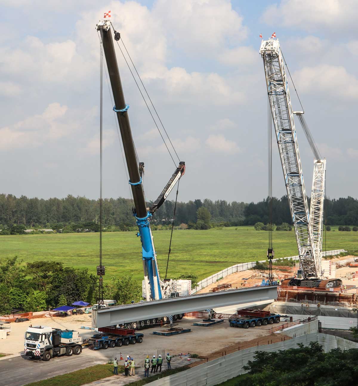 Bok Seng from Singapore (SG) deployed two large cranes for the installation of heavy concrete bridge beams. These are the Kobelco SL6000 and the Liebherr LTM 1750-9.1.