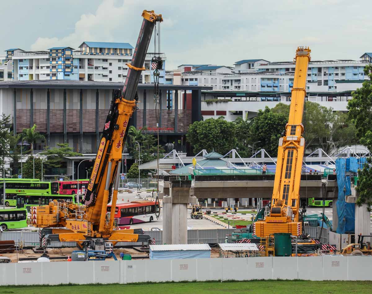 Two large mobile cranes from Peck Tiong Choon from Singapore (SG) are being prepared on a construction site there for heavy lifting operations.