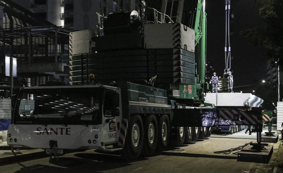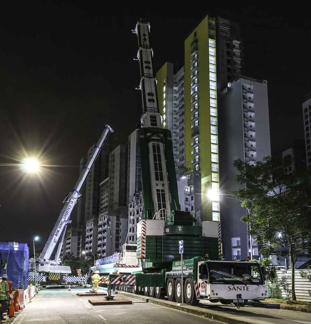 In October 2020 was in the city part Punggol in Singapore (SG) a pedestrian overhead bridge between two apaprtment blocks mounted. This bridge was produced somewhere else and was driven over the road to the construction site and would be positioned on site by use of two cranes. Here the bridge just arrived in the street.