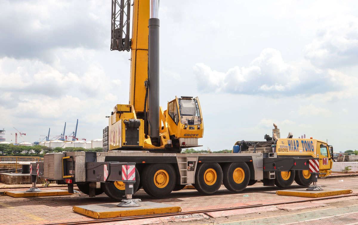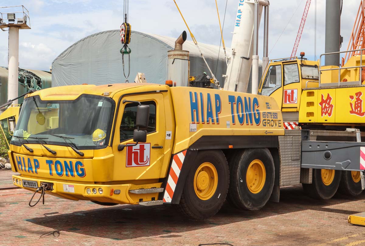 This attractive Grove GMK6300L belongs to Hiap Tong from Singapore (SG). It is a 300-tonne crane mounted on a 6-axle carrier.