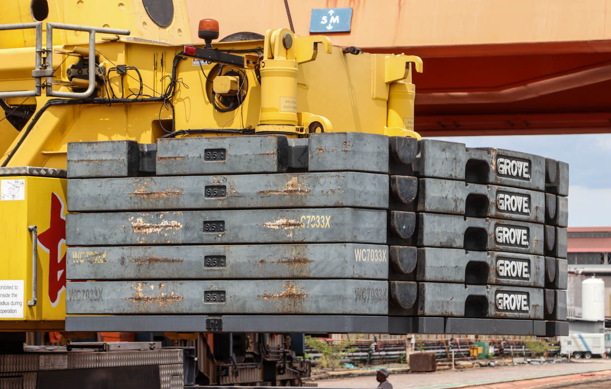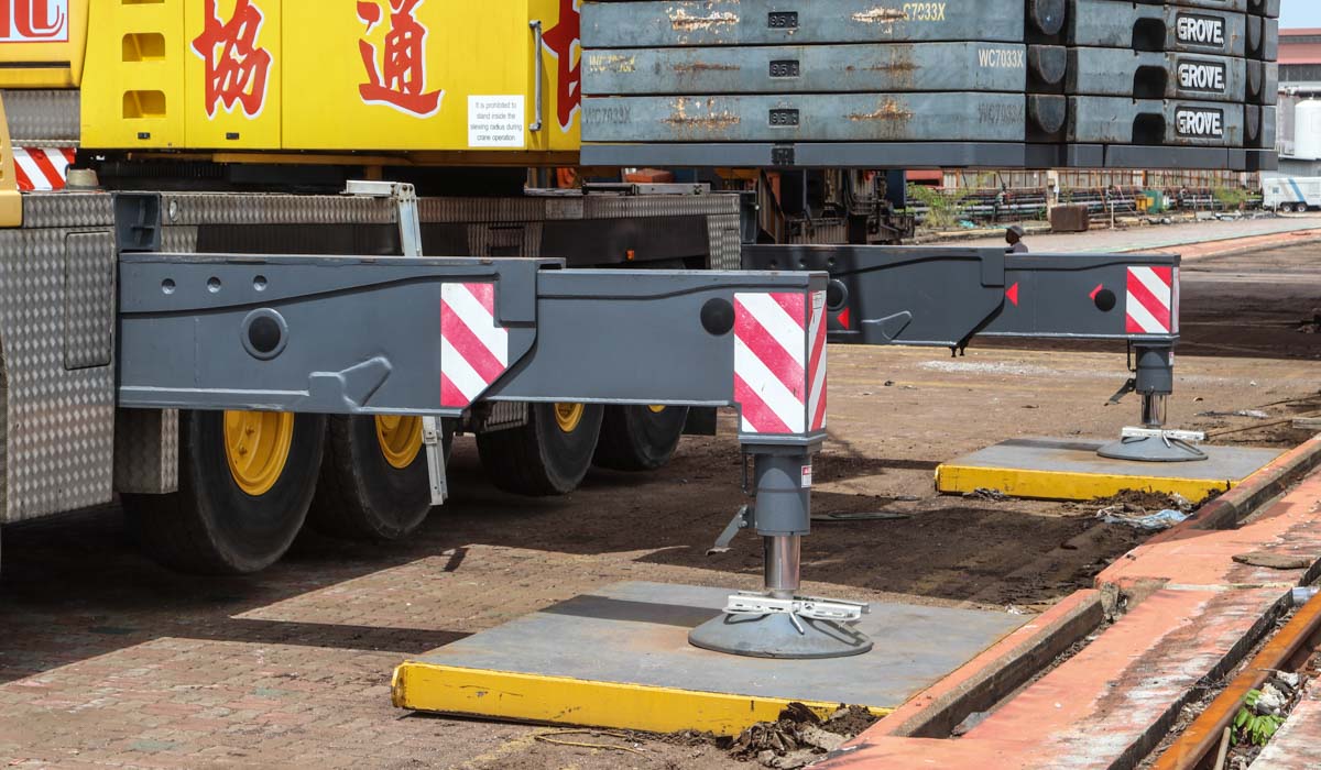 Here the crane was deployed with 54.5 tonnes of ballast, this ballast can be increased to 92.5 tonnes using two 10-tonne blocks and two 9-tonne blocks. The ballast has a turning radius of 5.5 metres. The crane is equipped with a 9.5-tonne hoist winch.