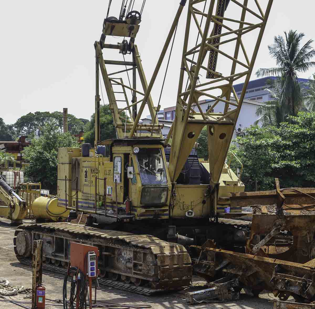 This fine Hitachi KH500-3 belongs to Antara Koh from Singapore (SG) and is deployed from a pontoon. It is a 100-ton crawler crane.