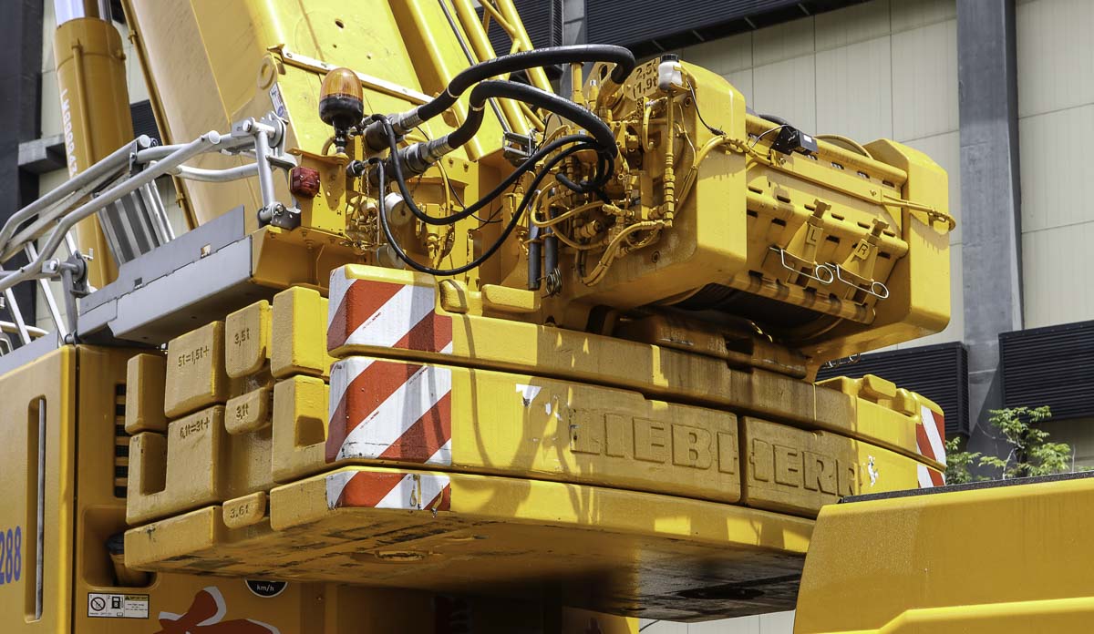 Here was the crane fitted with 14.7 tonnes of counterweight, the counterweight has a 4.11 meter tailswing. The full counterweight weights 25.7 tonnes. This crane is fitted with the optional second winch, the tailswing of the second winch is 4.58 meters.
