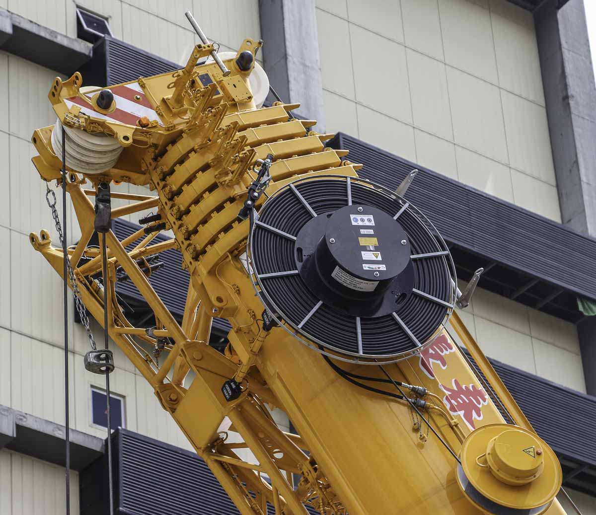 The crane has a 6-part main boom with an 11.5 meter base length that extends five times to a full length of 60 meters. This crane is fitted with the optional hydraulic jib, where the jib with a length of 10.8 - 19 meters can be hydraulically adjusted in an angle between 0 and 40 degrees.