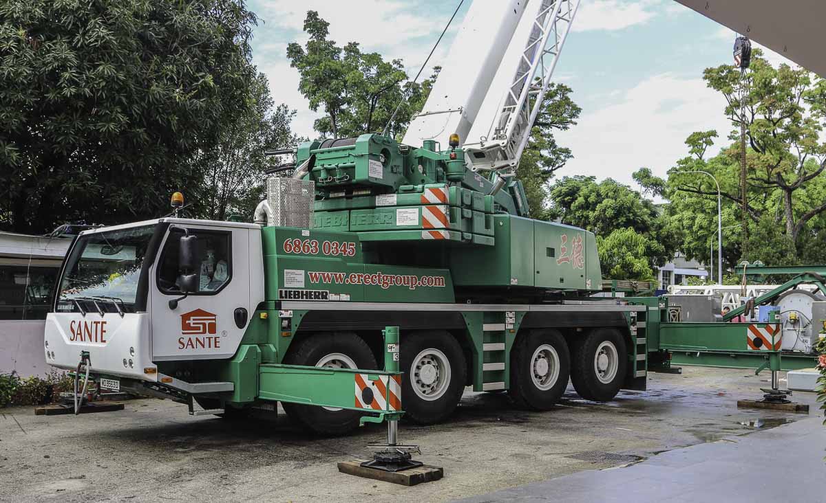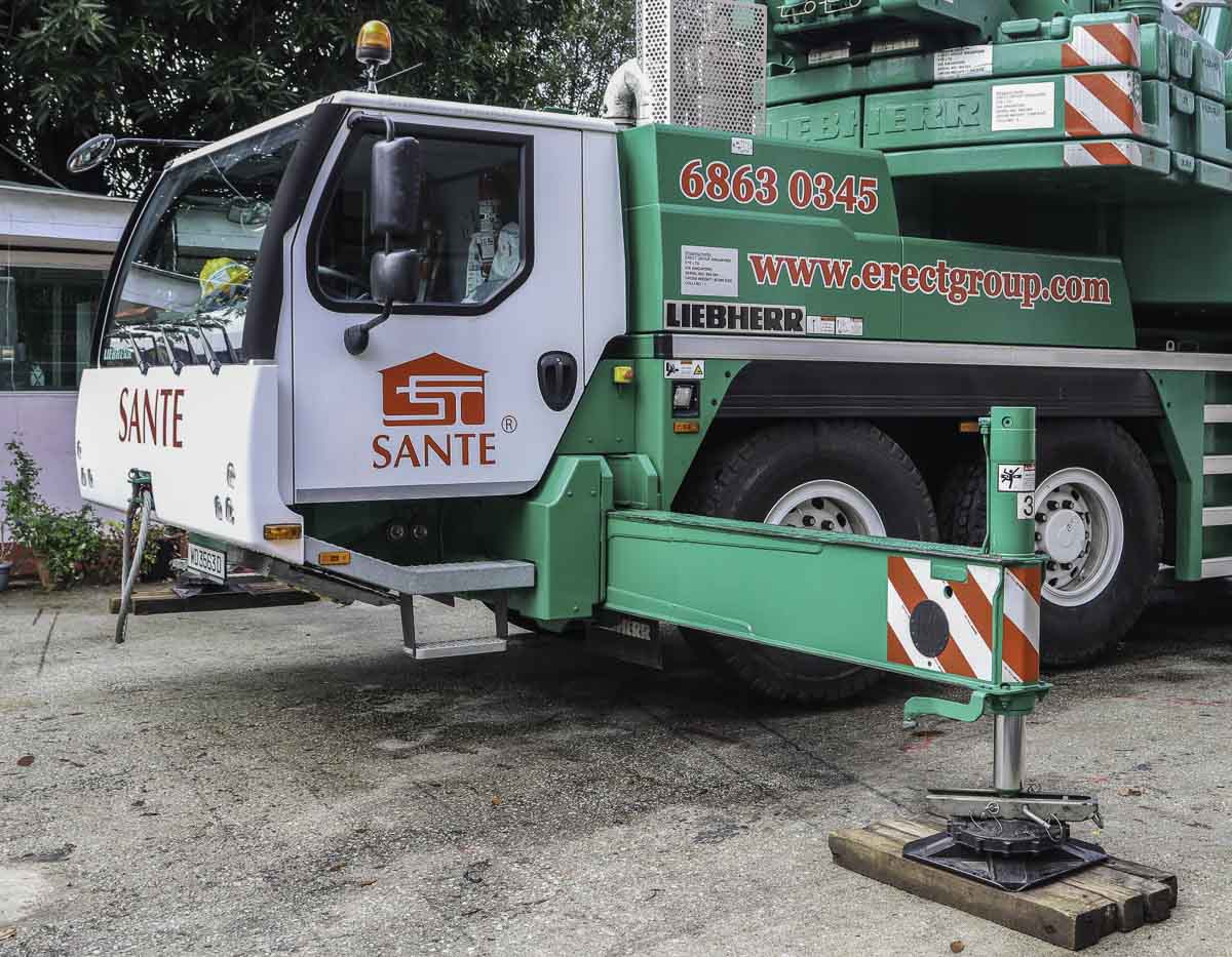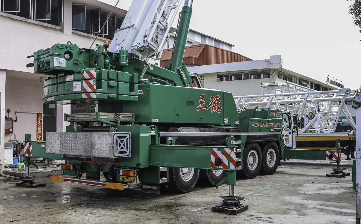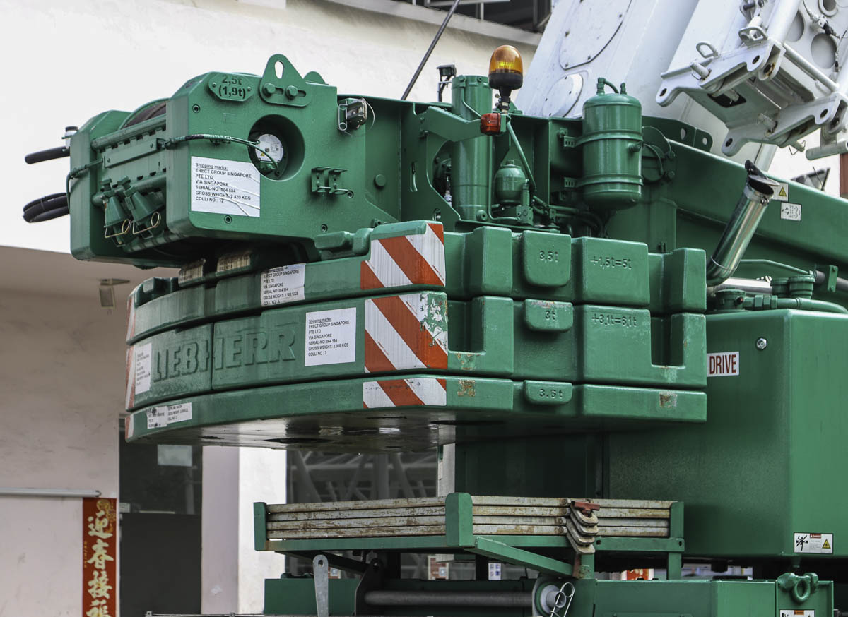 Sante from Singapore (SG) owns this fine Liebherr LTM 1100-4.2, which is often used as an auxiliary crane for their Liebherr LTM 1500-8.1 or for light work at their storage yard. It is a 100-tonne telescopic crane mounted on a 4-axle chassis.
