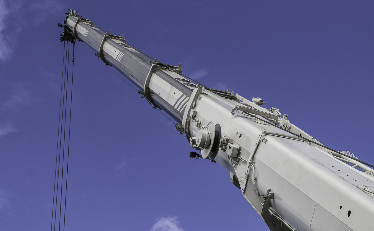 The seven-section main boom has a base length of 11.5 meters and extends six times to a maximum length of 60 meters. Here, the main boom is extended to a length of 33.8 meters.