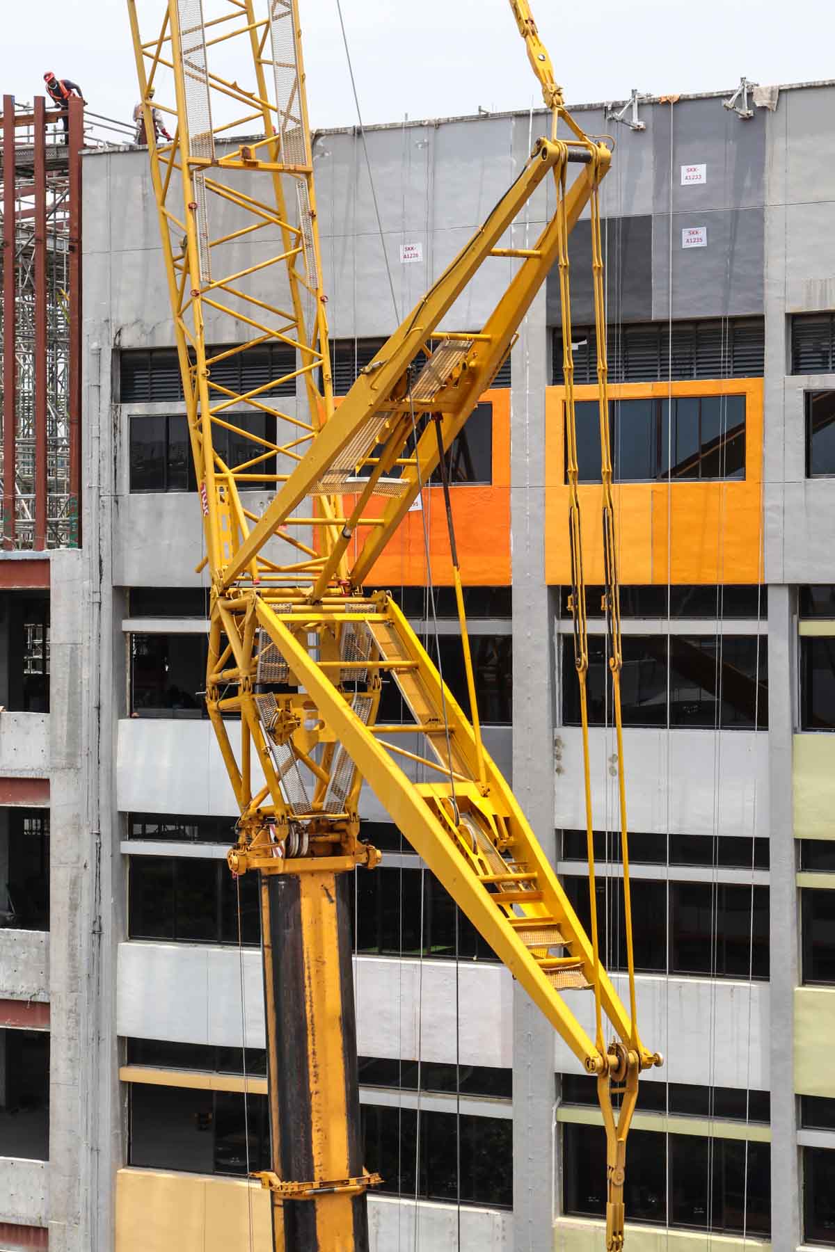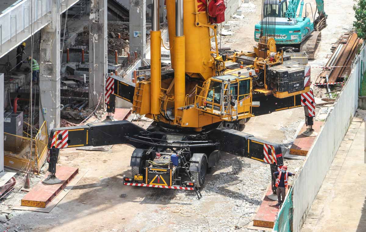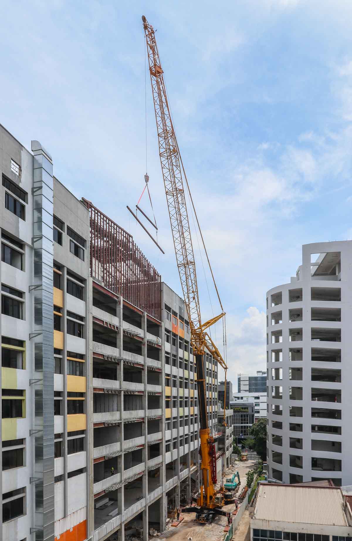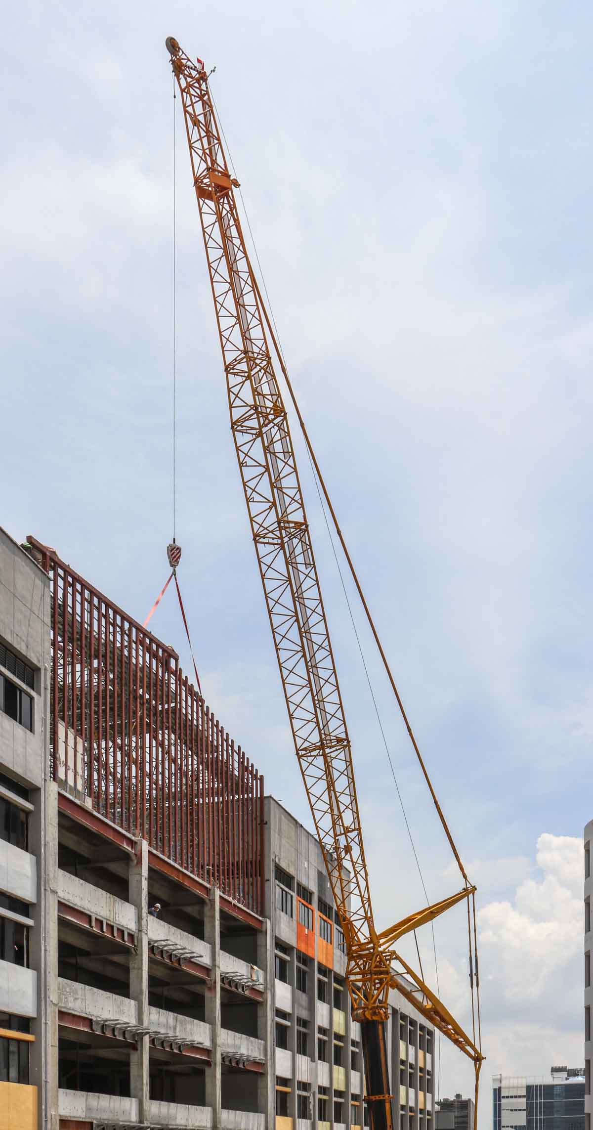 The main boom is extended here to a length of 28.6 metres. The final steel beams had to be installed at minimum radius. A fine crane from Tiong Woon!