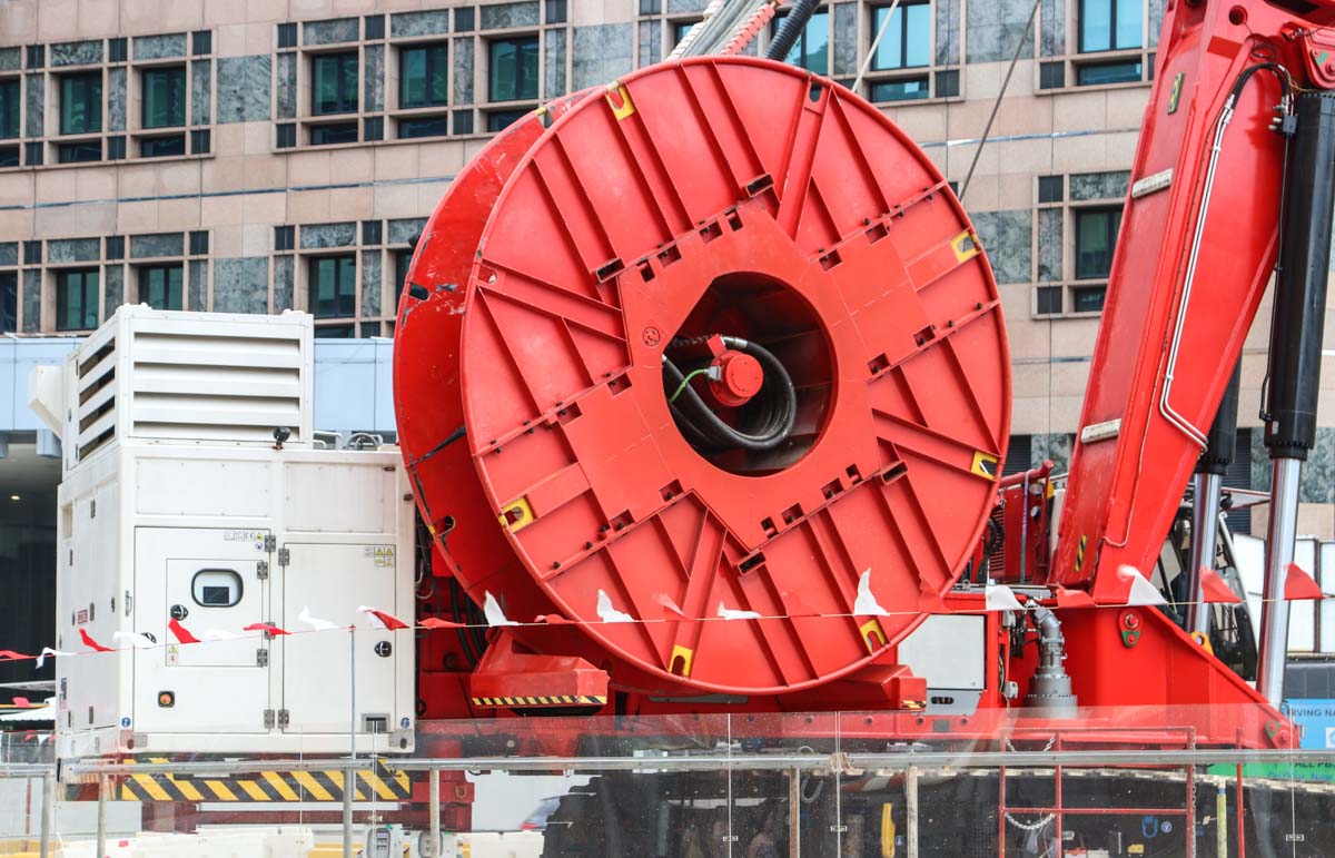 At the rear of the machine, two large drums are mounted; the front drum carries the cable package to control and drive the cutter. The other drum carries the discharge pipe to suction the cutter-excavated material out of the trench. At the rear of the machine, the 565 kW power pack is mounted to drive the complete machine.