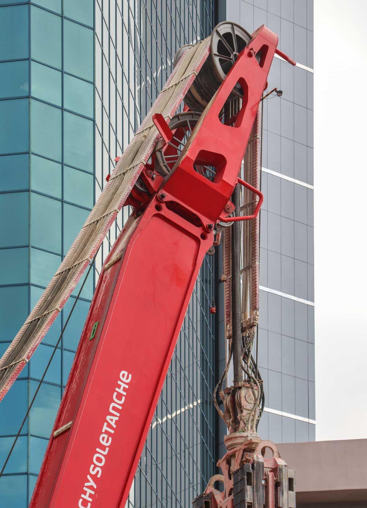 The enormous cutter suspended in the machine is used to construct diaphragm walls. The thickness of the cutter can be configured between 0.8 and 1.8 metres and a width between 2.8 and 3.8 metres. The cutter can be rotated hydraulically in relation to the base machine. The cutter was developed by Soletanche Bachy in order to cutter-excavate in very hard rock, up to 200 MPa.