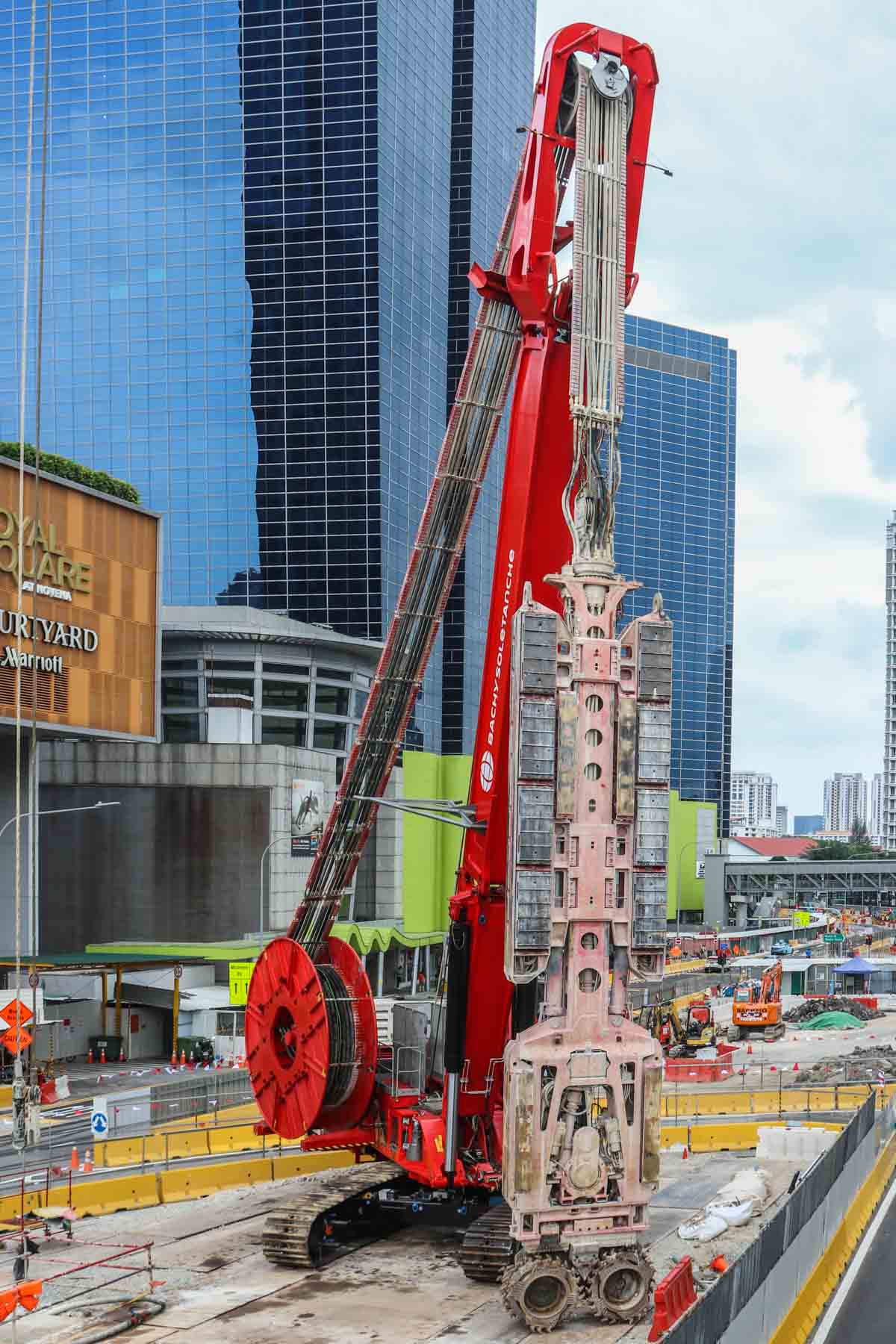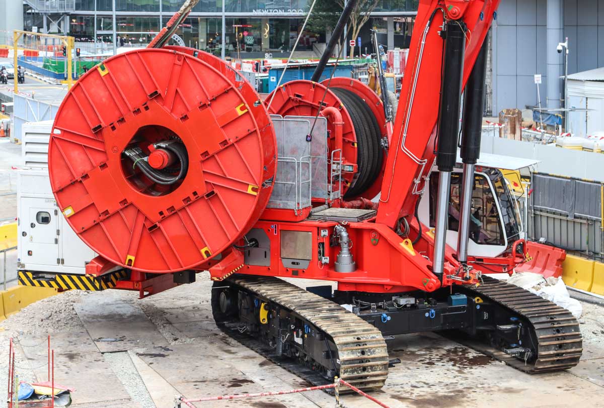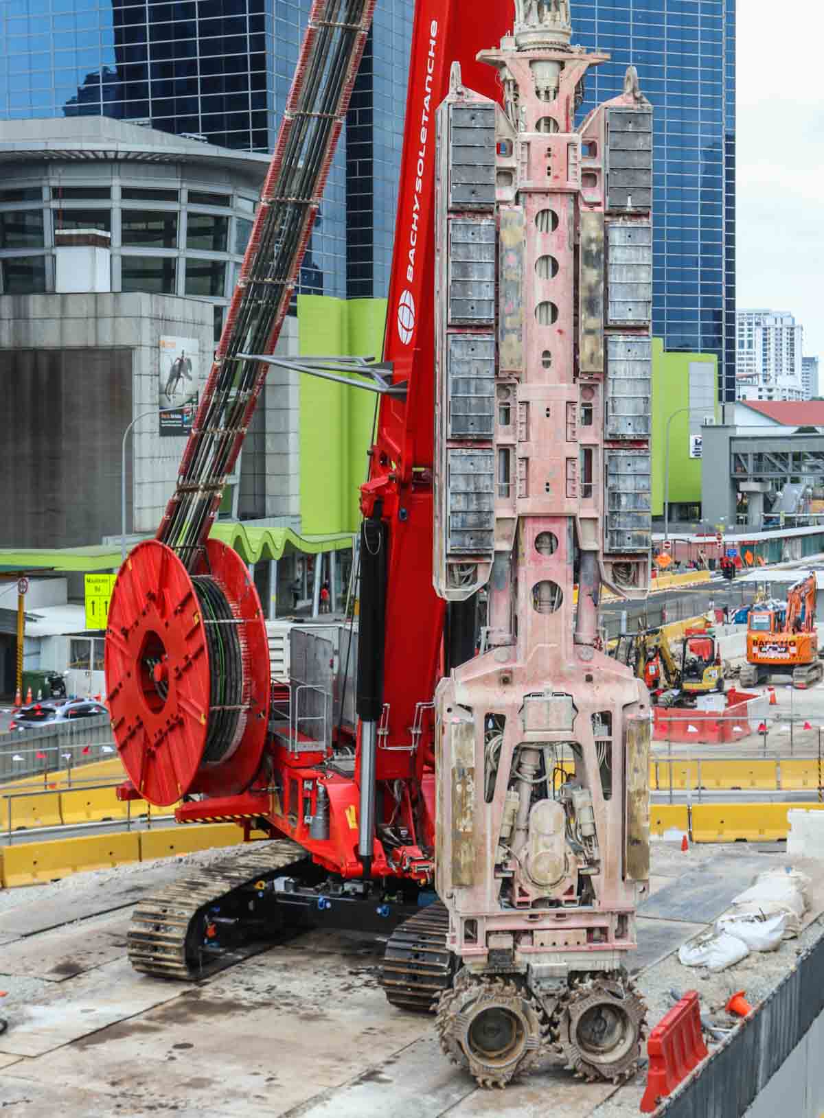 This interesting Hydrofraise HF8 was deployed by Bachy Soletanche for the first time on a major project in Singapore (SG). This machine was developed and built at the Soletanche Bachy headquarters in France. This machine has a total weight of approximately 230 tonnes.