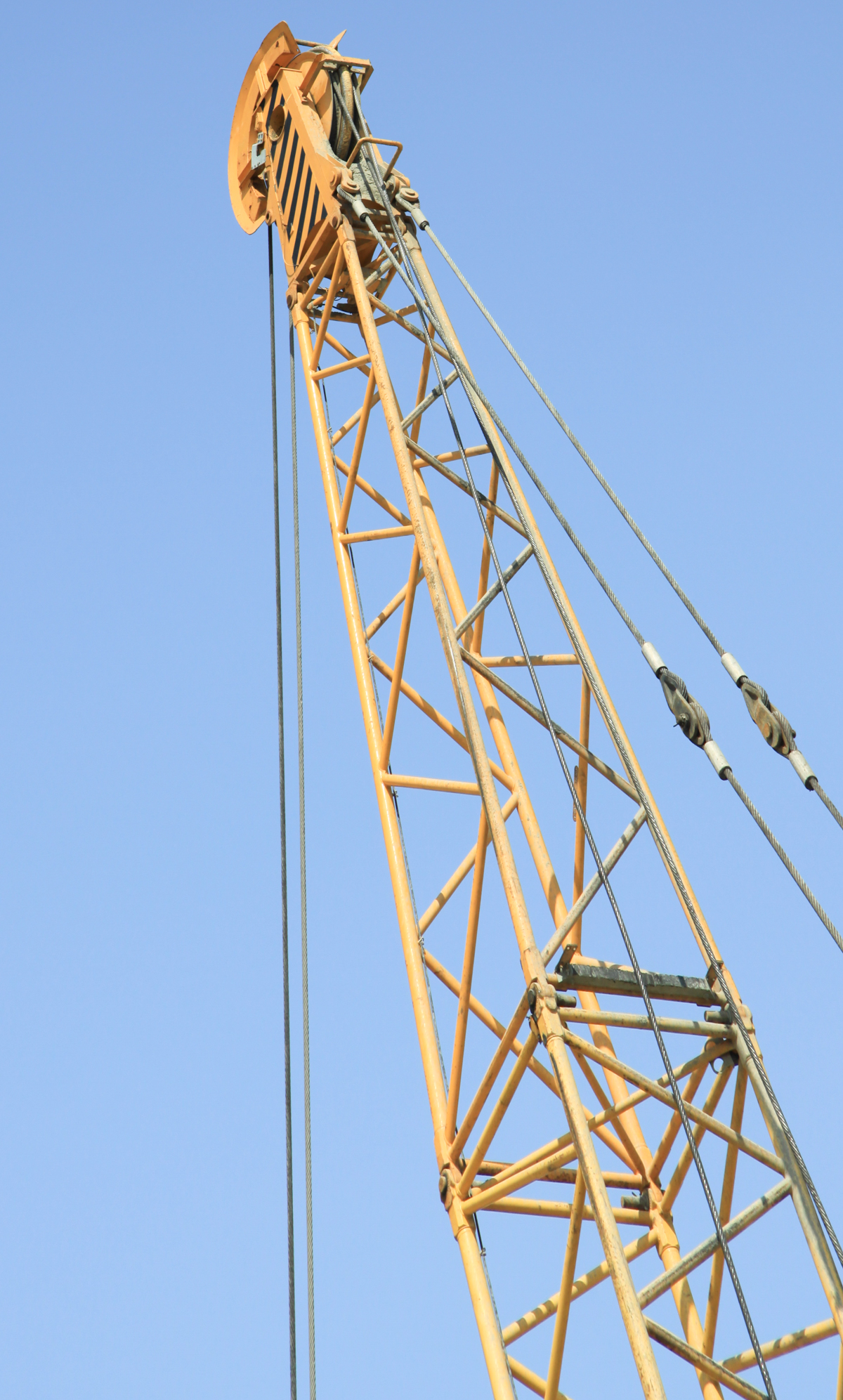 The head with two big steel sheaves is used here, better known as the "dragline-head" - this crane was bought used as dragline from Denmark.