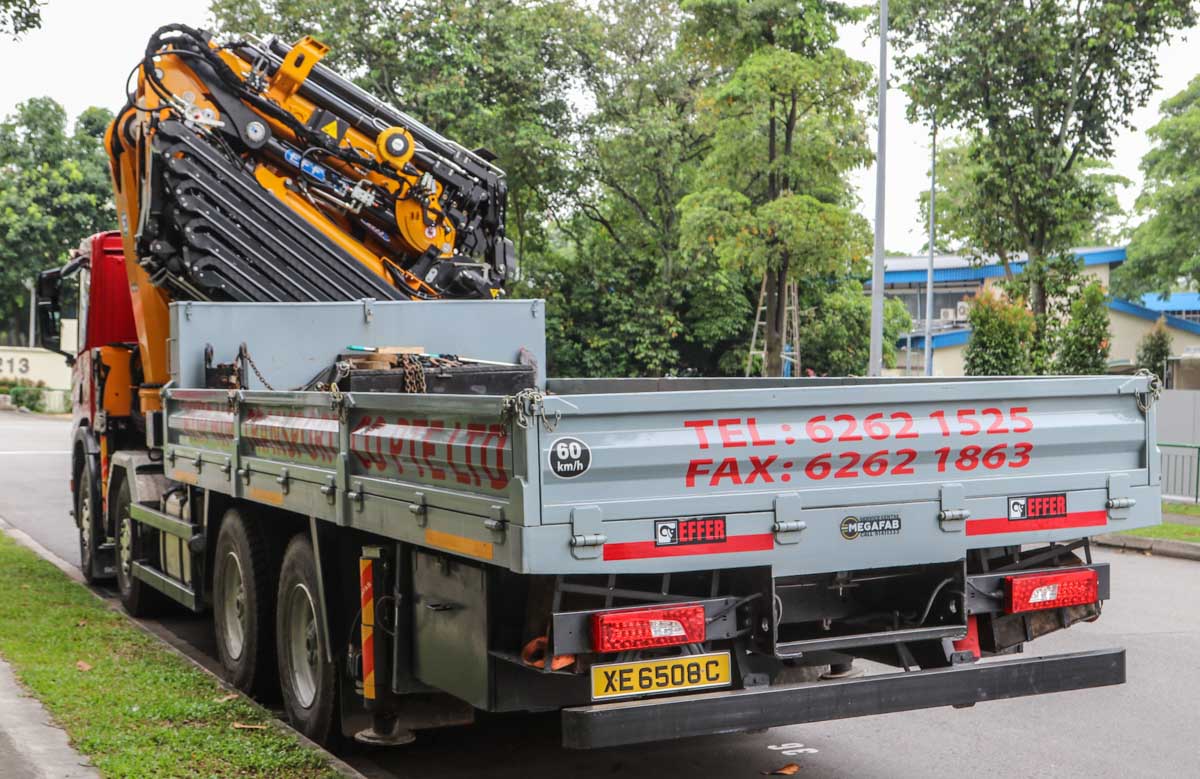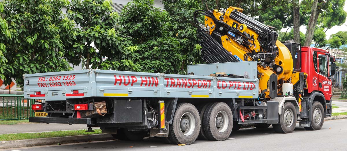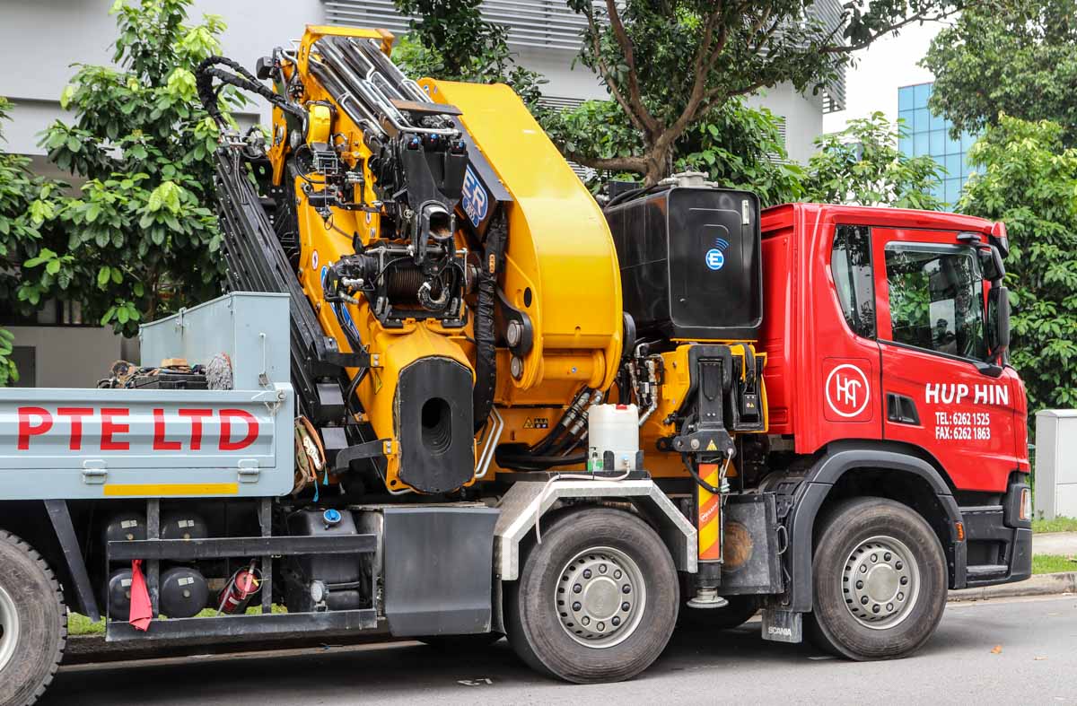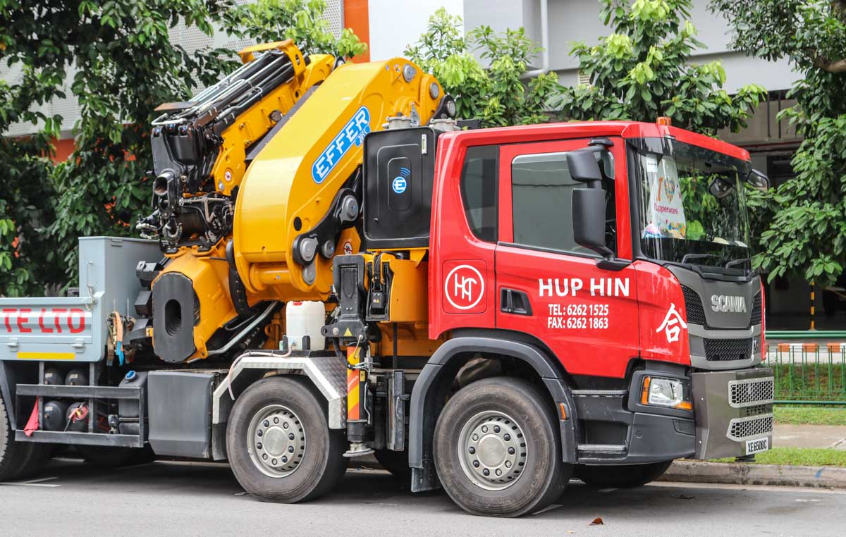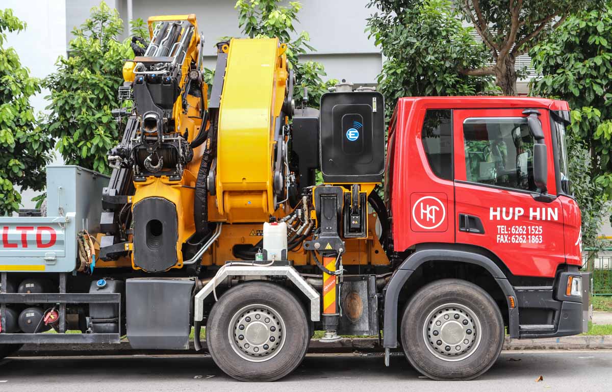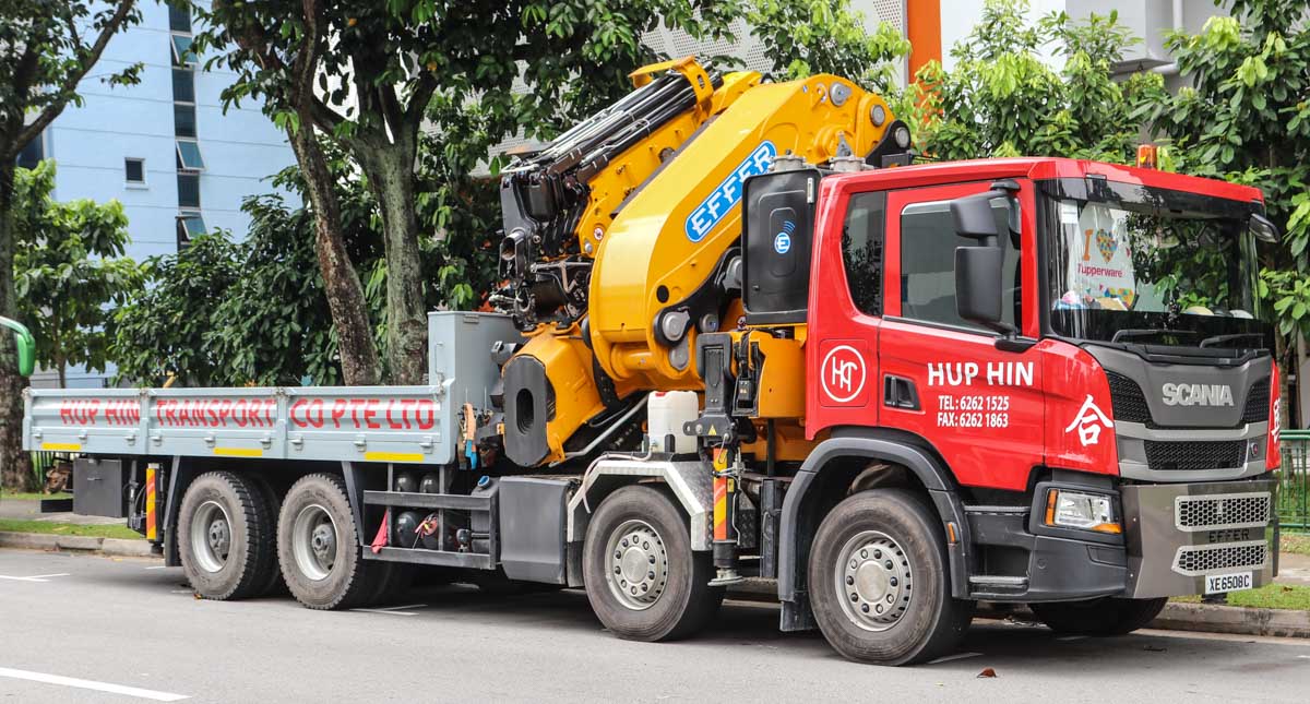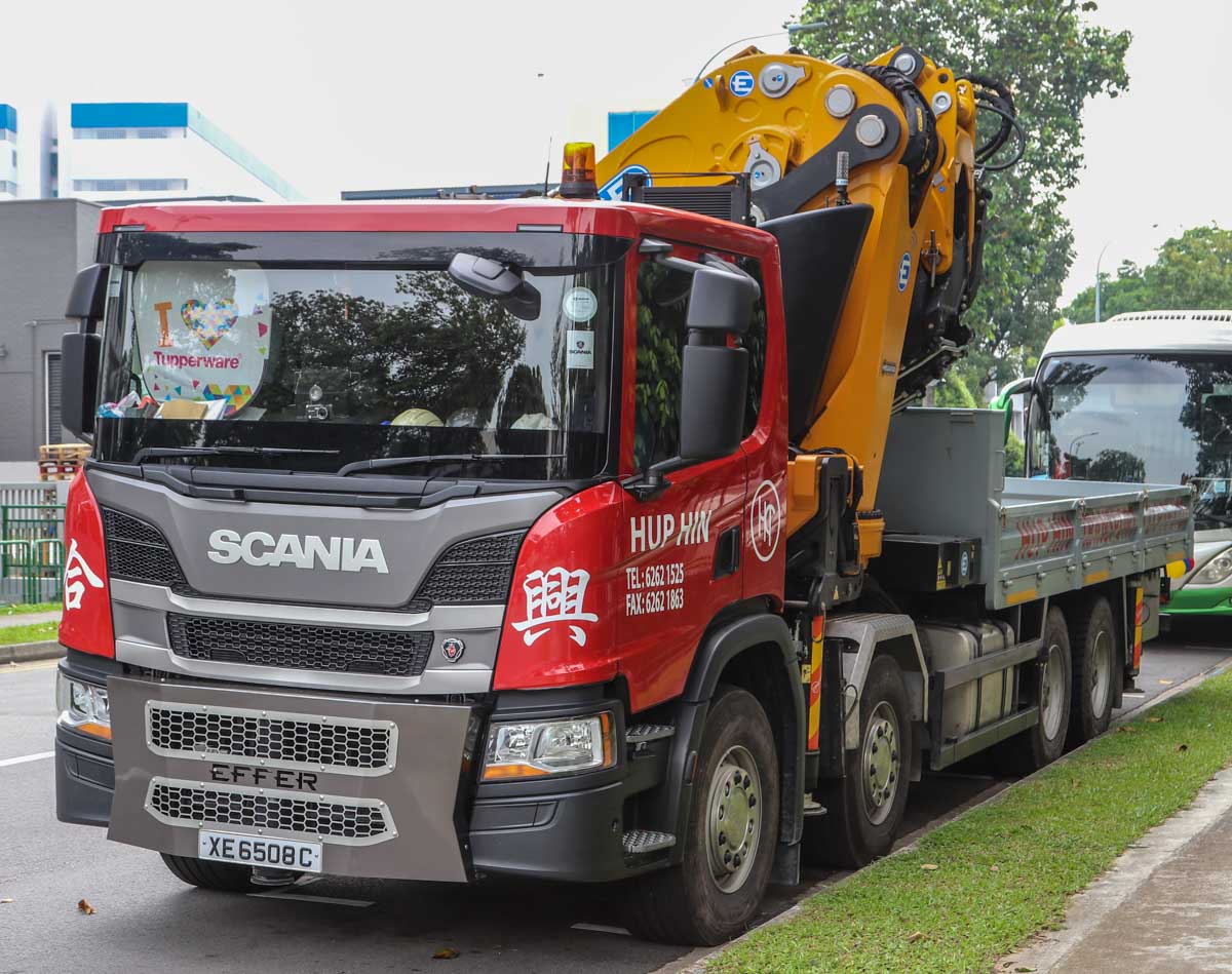 This impressive and new Scania P 450 of Hup Hin from Singapore (SG) was parked in an industrial area during a weekend. It is a 4-axle truck equipped with a heavy loader crane and cargo bed.